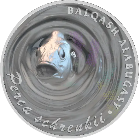 По окружности размещены надписи с названием вида: на казахском языке и латинском — «Perca schrenkii». В нижней части указан год чеканки — «2023».