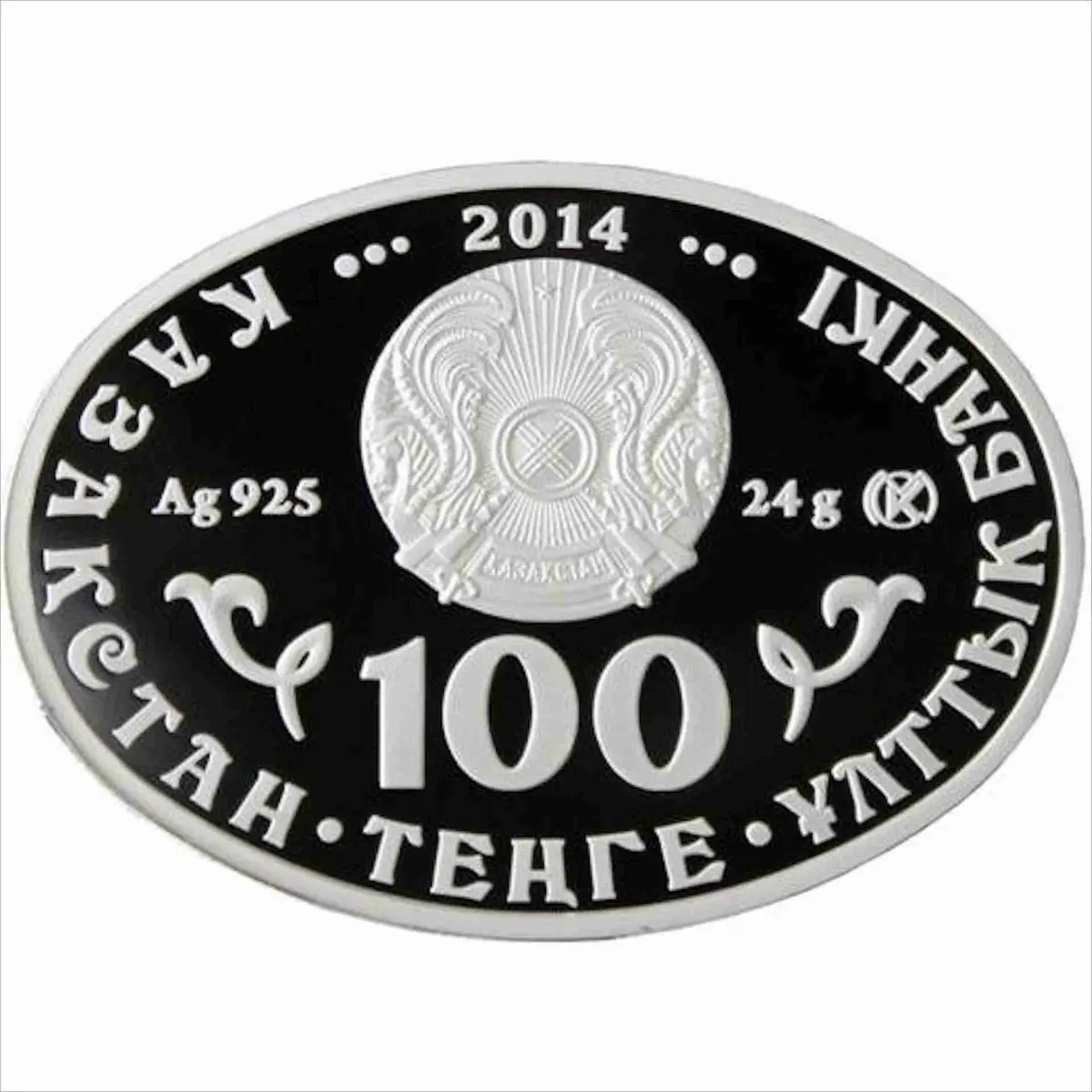 Также размещена надпись «100 ТЕҢГЕ», обозначающая номинал, и товарный знак Казахстанского монетного двора. По овалу проходит надпись «ҚАЗАҚСТАН ҰЛТТЫҚ БАНКІ», а также указан год чеканки — «2014».