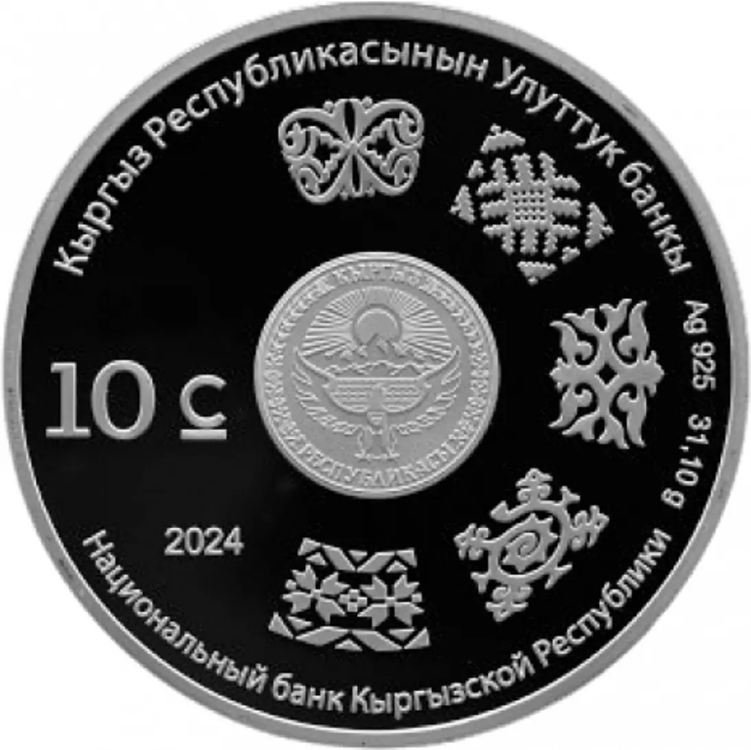 На оборотной стороне монеты, в центре размещен герб Кыргызской Республики. В правой части монеты расположены национальные орнаменты стран - участниц ЕАЭС, а также указаны проба металла (Ag 925) и вес монеты (31,10 g). В верхней и нижней части монеты расположена надпись: "Кыргыз Республикасынын Улуттук банкы /Национальный банк Кыргызской Республики". В левой части монеты указаны номинал монеты (10), графический знак сома (С) и год выпуска монеты "2024".
