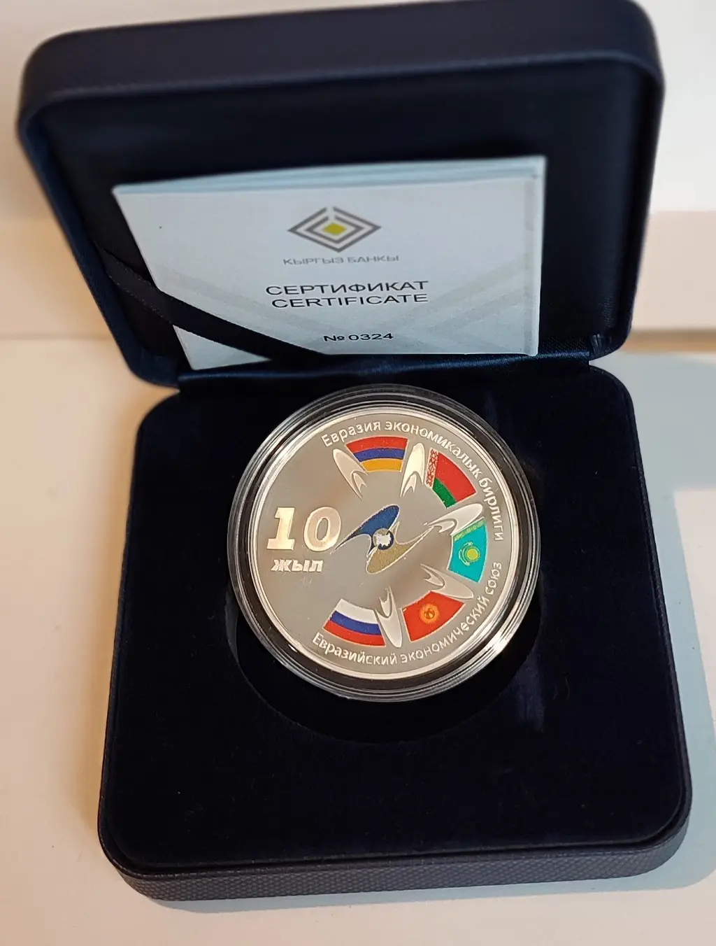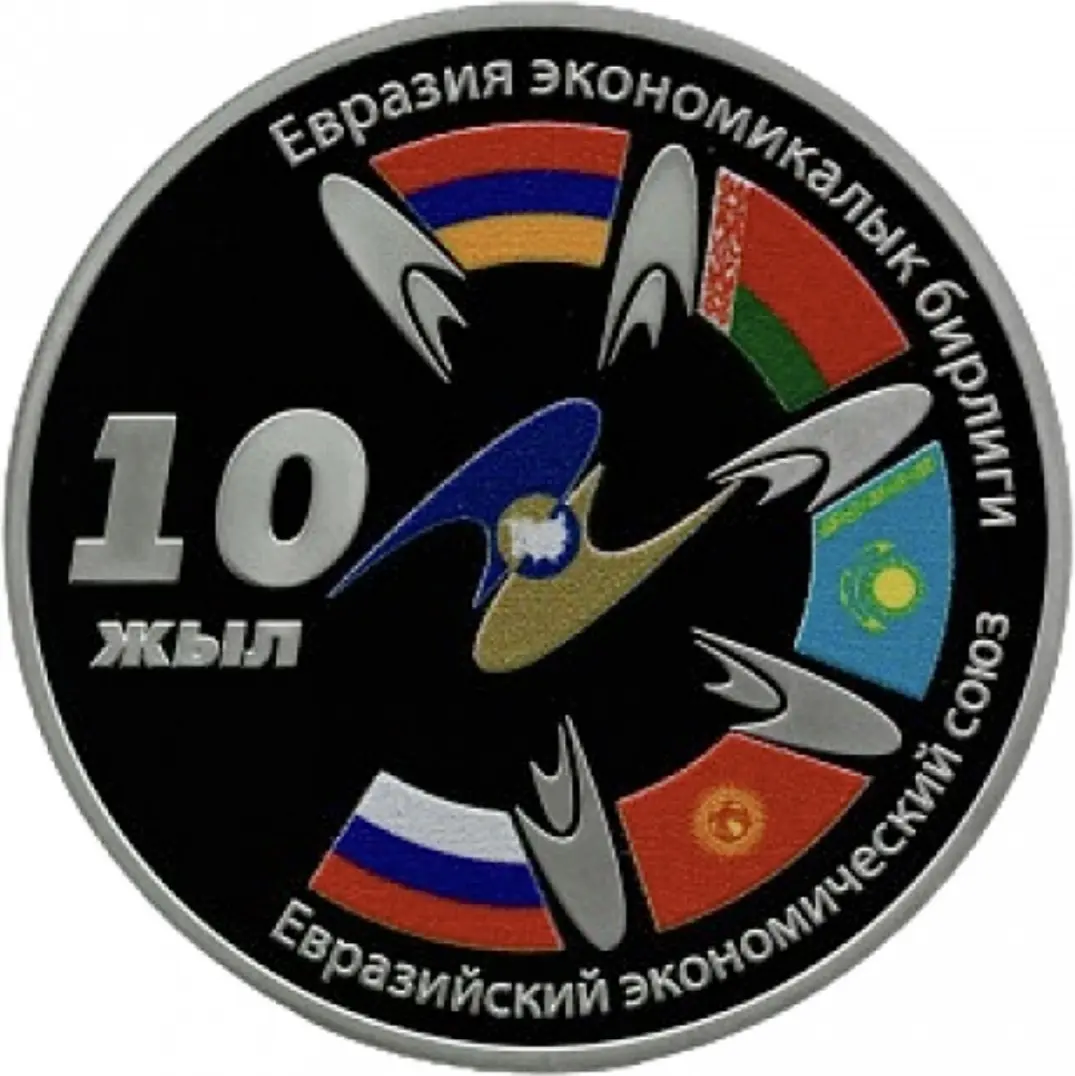 Юбилейную монету в честь 10-летия Евразийского экономического союза (ЕАЭС) выпустил Национальный банк Кыргызской Республики. Номинал денежного знака из серебра составил 10 сомов, а дополняют его цветные части. Он вошел в серию «Исторические события».