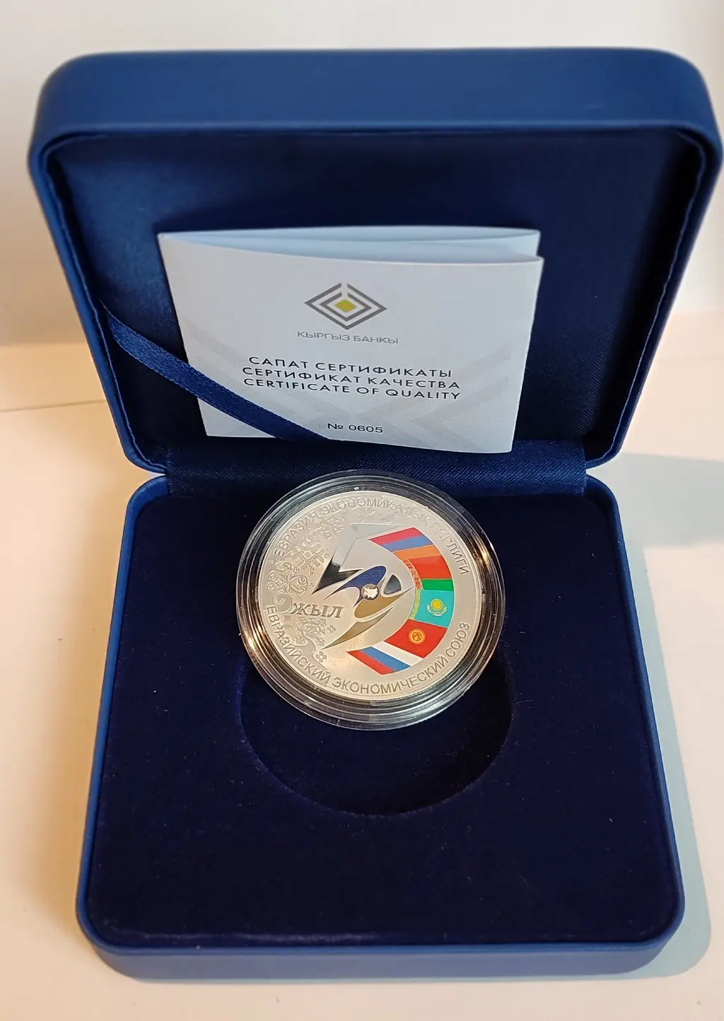 Коллекционная монета посвящена 5-летию образования Евразийского экономического союза (далее – ЕАЭС) и выпущена в рамках международной монетной программы центральных (национальных) банков государств-членов ЕАЭС.