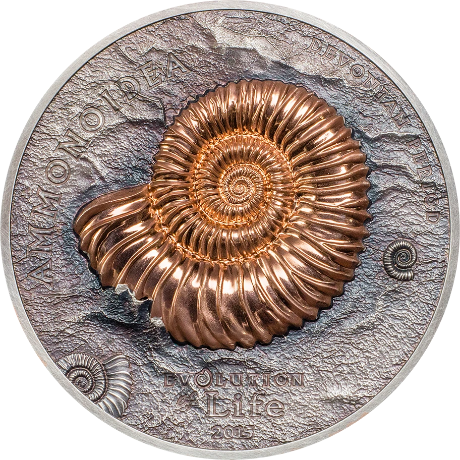 На реверсе изображён древний аммонит — вымерший морской моллюск, живший миллионы лет назад. Его спиральная раковина детально проработана и выполнена в высоком рельефе, благодаря чему создаётся ощущение настоящего окаменелого ископаемого. Поверхность монеты подчёркивает структуру и текстуру раковины, усиливая эффект глубины и древности. В композиции также присутствует название серии Evolution of Life и наименование выпуска — Ammonite.