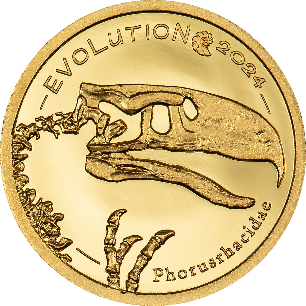 На реверсе этой золотой монеты застыла история доисторического хищника — форорусхацида (Phorusrhacidae), прозванного «террор-птицей». Детально проработанный череп с массивным клювом и фрагменты скелета словно переносят нас в далёкое прошлое, где эти грозные пернатые владычествовали над землёй, а надпись «EVOLUTION 2024» напоминает о бесконечном пути развития жизни на планете.