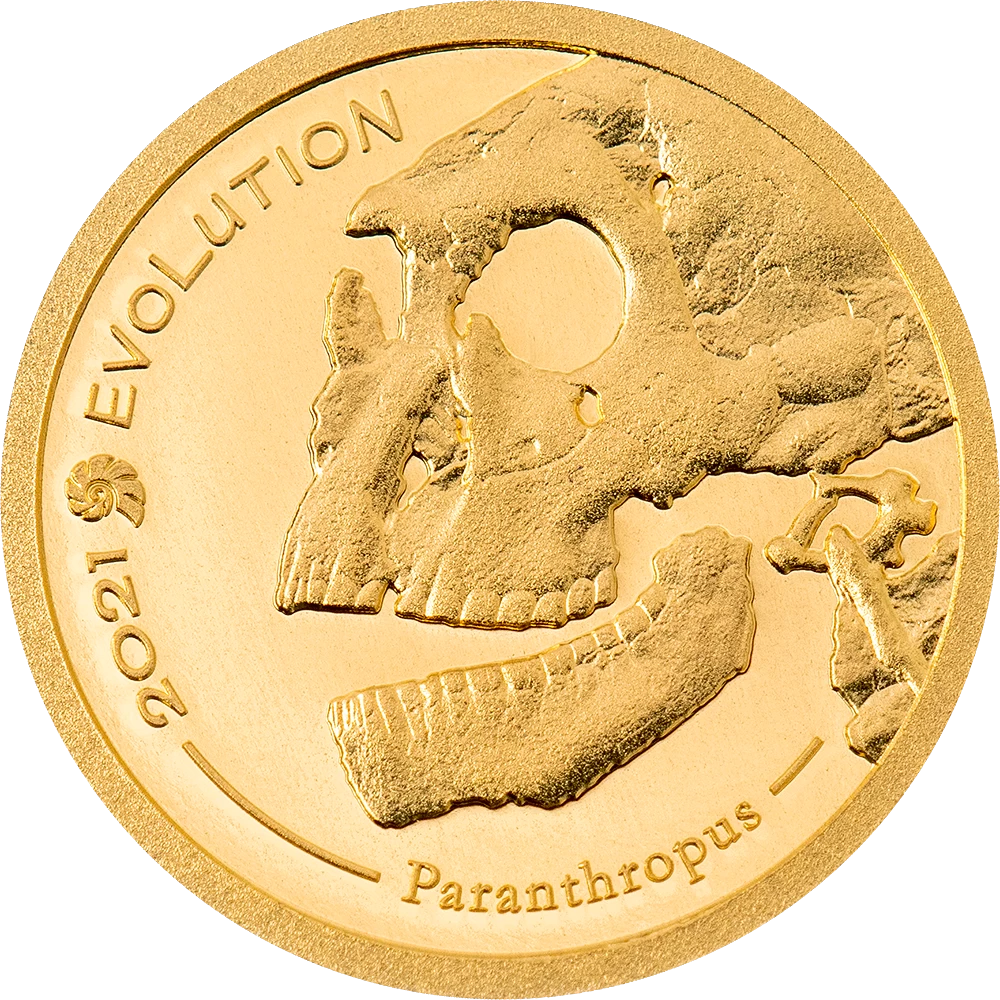 На реверсе этой золотой монеты словно застыл миг древней истории: в центре — детально проработанный череп параантропа, одного из наших далёких предков. Его массивные челюсти и выраженные надбровные дуги будто рассказывают о суровой борьбе за выживание в доисторические времена, а надписи «2021 EVOLUTION» и «Paranthropus» напоминают о долгом и удивительном пути эволюции, который привёл к появлению современного человека.