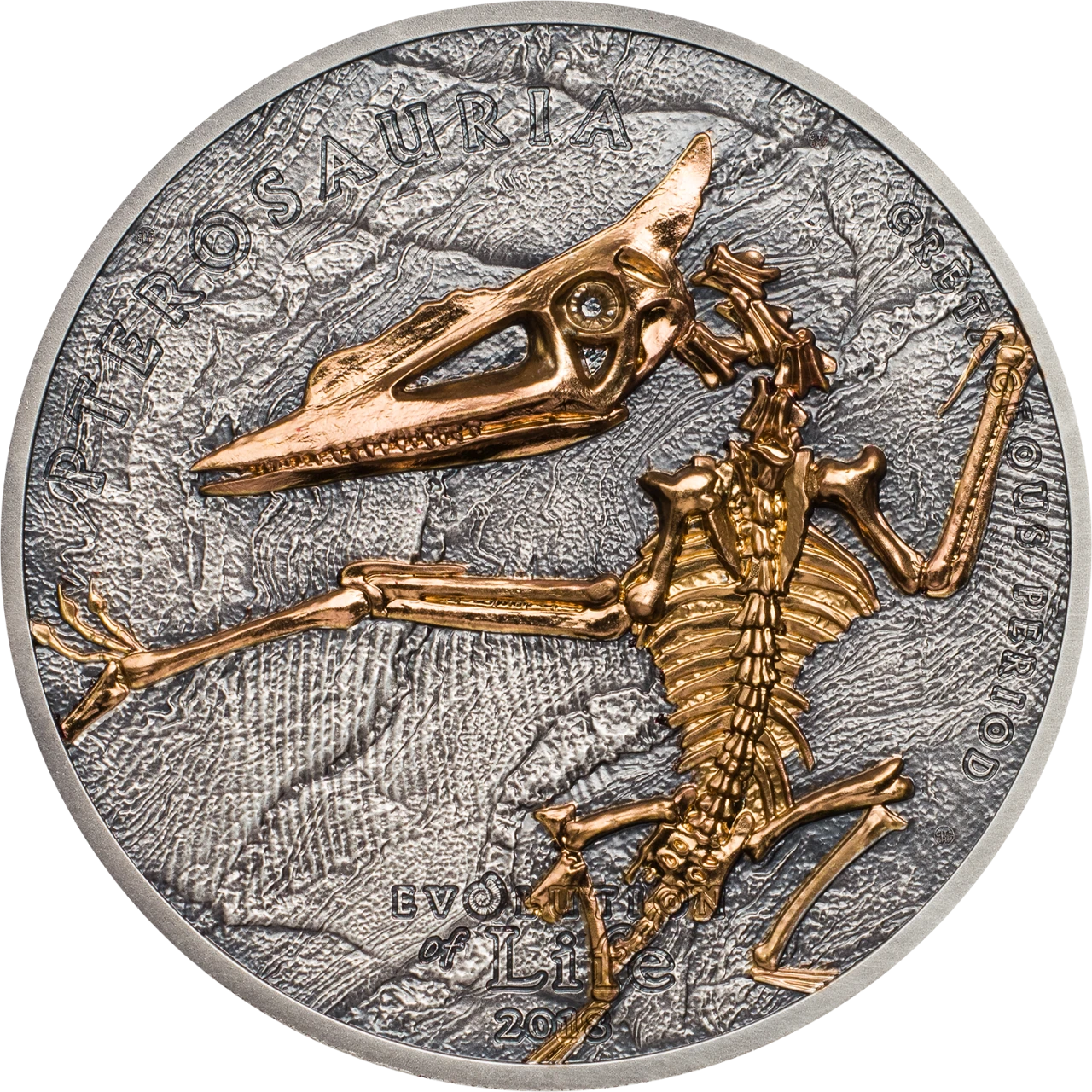 Эта монета — вершина серии по уровню детализации: даже тонкие перепонки крыльев птерозавра искусно вписаны в текстуру фона. Птерозавры вошли в историю эволюции как одна из трёх групп позвоночных, освоивших активный полёт (наряду с птицами и летучими мышами).