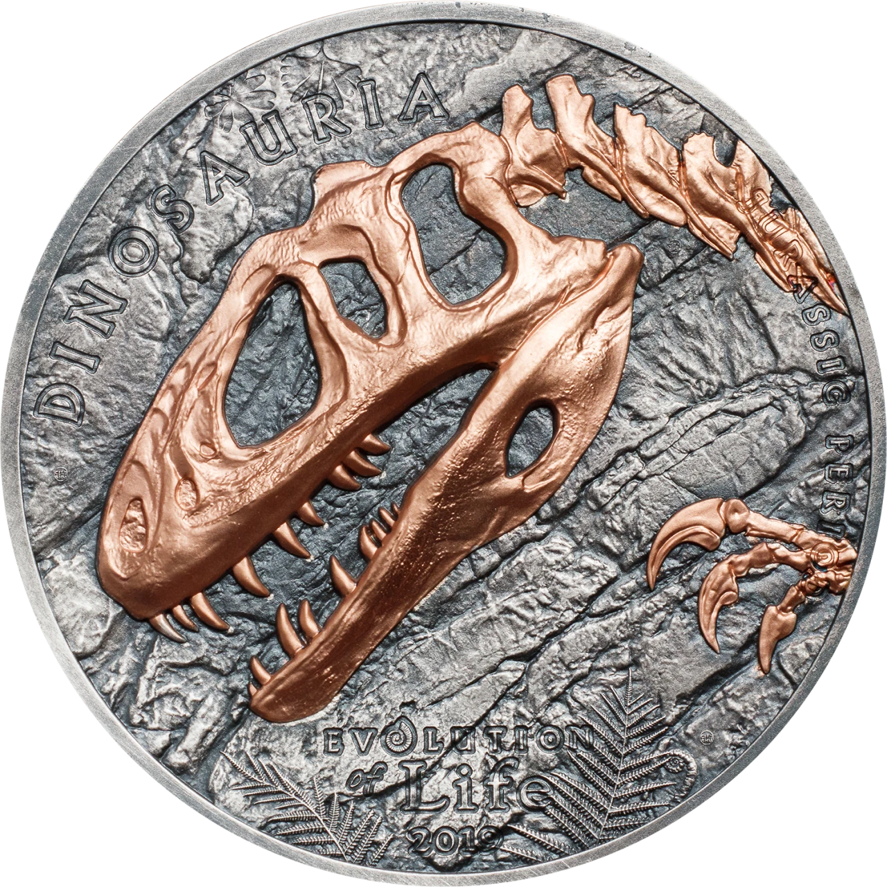 На реверсе этой впечатляющей монеты словно оживает доисторическая сцена: в центре композиции — величественный скелет динозавра, будто только что извлечённый из недр земли. Череп и часть позвоночника, выполненные с поразительной детализацией в тёплом медном оттенке, контрастируют с текстурированным серебристым фоном, имитирующим грубую поверхность древних осадочных пород.