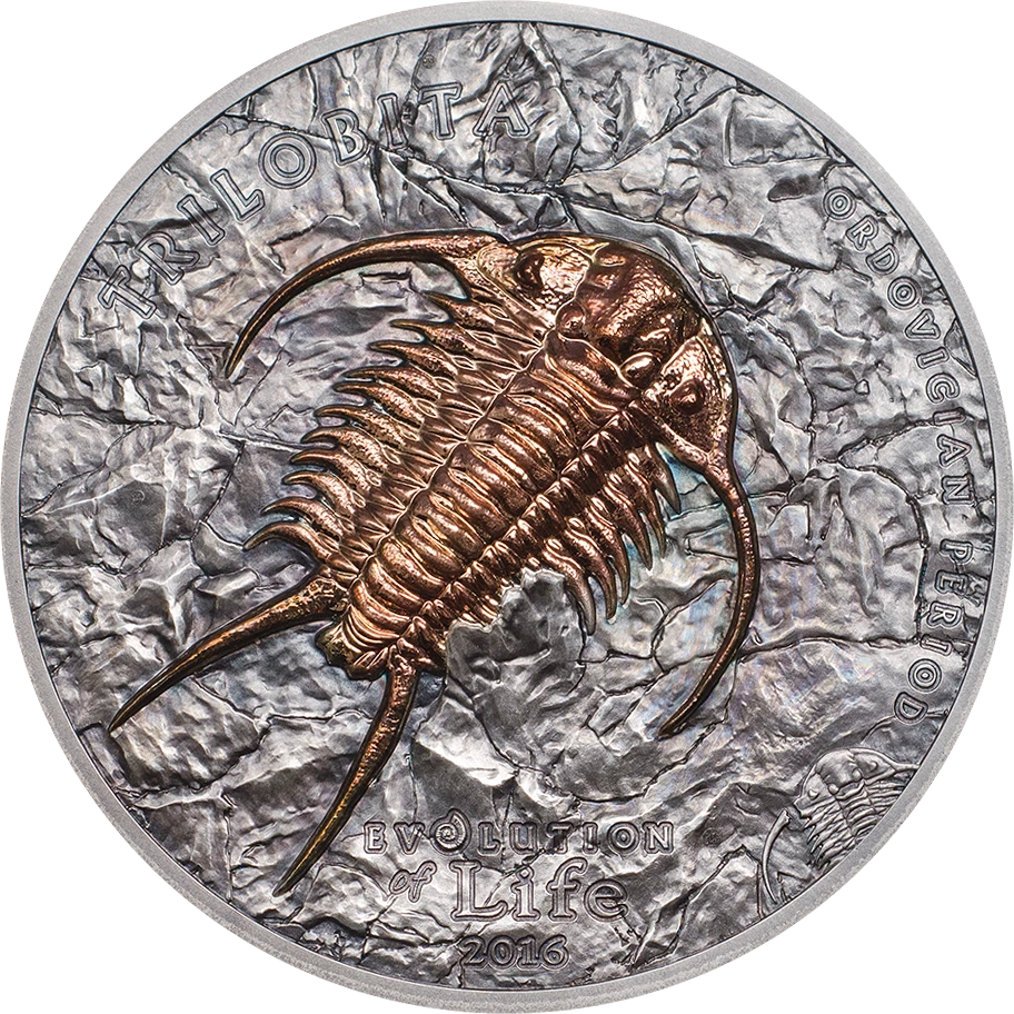 Второй выпуск серии «Эволюция жизни» представлен серебряной монетой 999‑й пробы весом 1 унция. Экспозиция серии, посвящённая эволюции жизни на Земле, включает изображение трилобита — оно воссоздано по подлинной окаменелости возрастом 470 миллионов лет. Ископаемый образец был обнаружен в окрестностях Санкт‑Петербурга. Монета отличается высоким рельефом изображения и эффектной красно‑золотой отделкой. Общий тираж ограничен 999 экземплярами во всемирном масштабе.