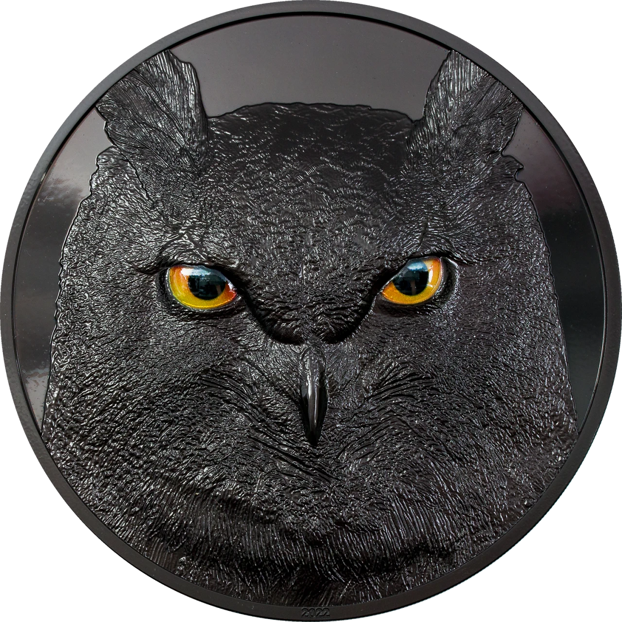 На реверсе монеты словно застыл пронзительный взгляд ночного стража — величественного филина. Его чёрные перья будто поглощают свет, а ярко-оранжевые глаза, полные мудрости и таинственности, неотрывно следят за зрителем, погружая в атмосферу ночной тишины и загадочности.