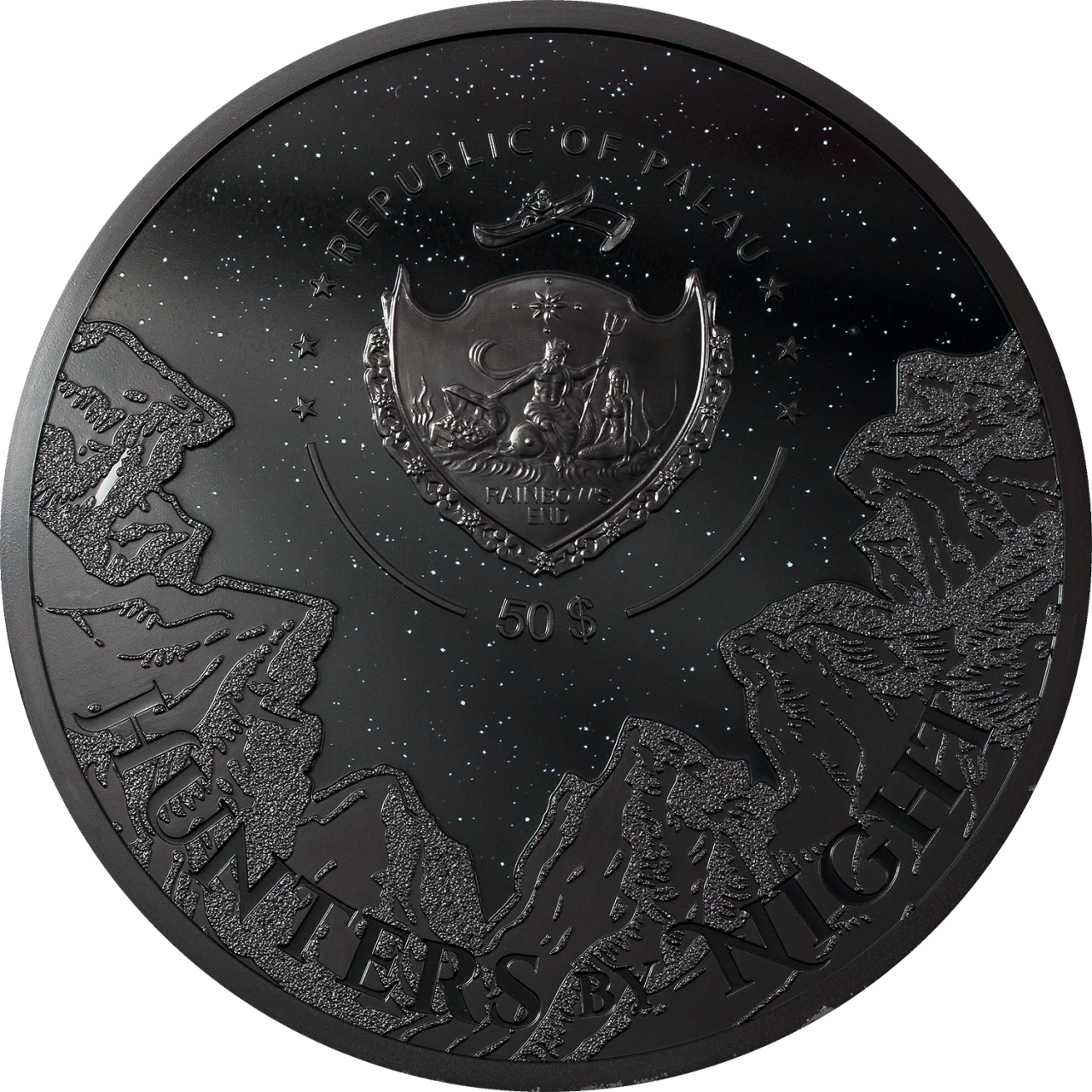 На аверсе этой монеты разворачивается таинственная ночная сцена: герб Республики Палау, украшенный мифологическими фигурами, словно всплывает из лунного света на фоне усыпанного звёздами неба. Тёмные, рельефные очертания гор по краям композиции создают ощущение глубины и загадочности, будто охраняют этот мир ночных тайн. Надписи «REPUBLIC OF PALAU», «50$» и «HUNTERS BY NIGHT» подчёркивают принадлежность монеты к серии, посвящённой ночным охотникам, и добавляют ей особый шарм — словно приглашение окунуться в атмосферу ночных приключений.