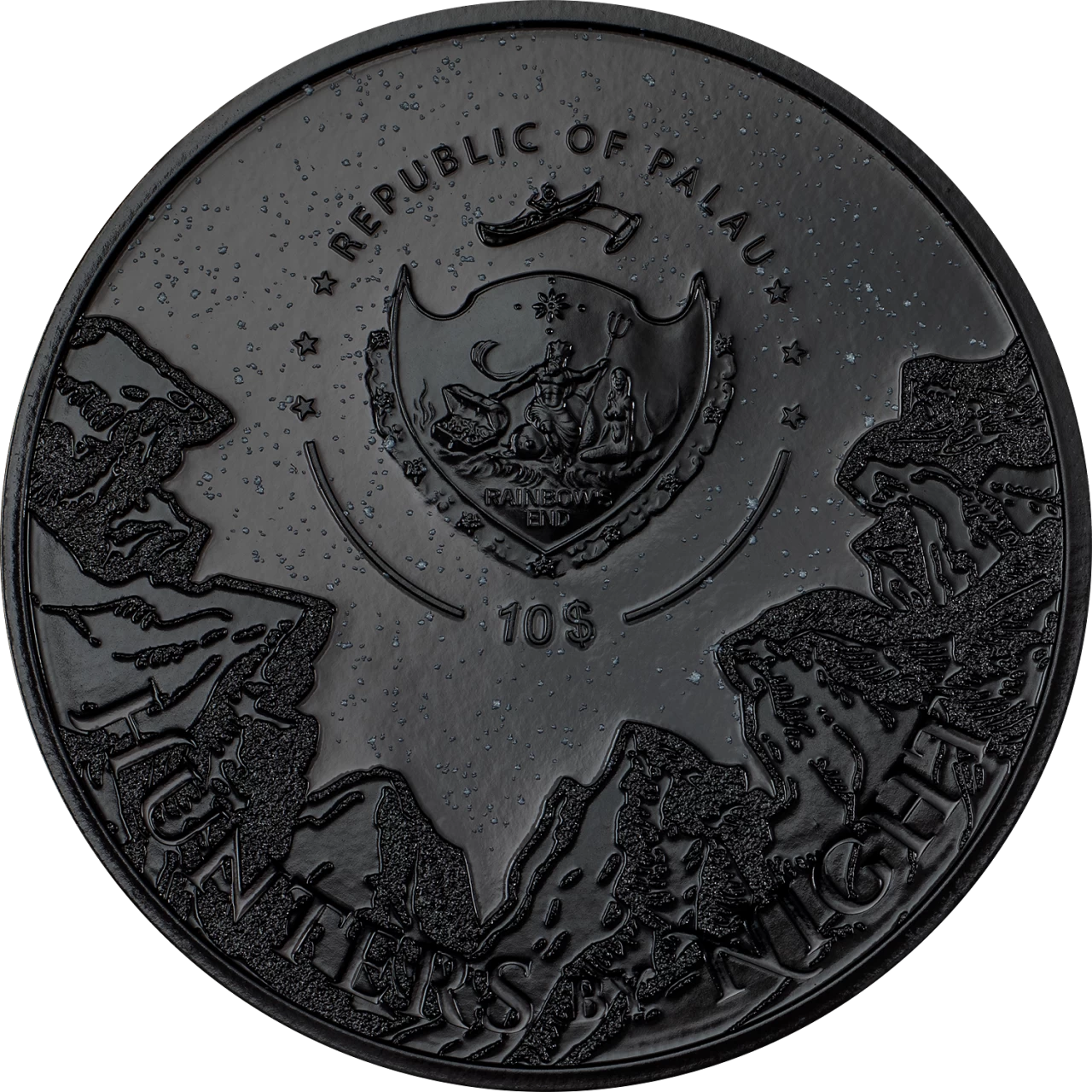 На аверсе этой монеты словно застыла таинственная ночная сцена: на фоне звёздного неба, усыпанного мерцающими точками, возвышаются тёмные силуэты гор, а в центре сияет герб Республики Палау. Надпись «HUNTERS BY NIGHT» придаёт композиции загадочность, будто приглашая зрителя в мир ночных охотников, скрывающихся в тени горных вершин, а номинал «10$» и надпись «REPUBLIC OF PALAU» подчёркивают официальный статус этого художественного произведения в металле.