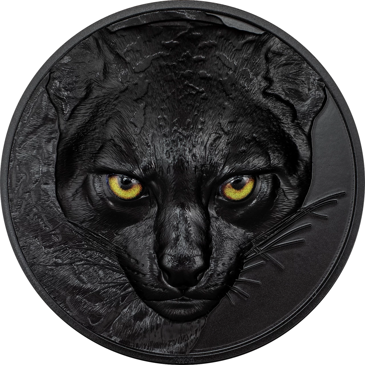 На реверсе монеты, словно вынырнув из ночной тьмы, пристально смотрит чёрная пантера. Её ярко-жёлтые глаза, полные хищной мудрости, будто проникают в душу, а детализированная текстура шерсти и чётко прорисованные усы придают образу невероятную реалистичность — кажется, что зверь вот-вот сорвётся с монеты в стремительном прыжке, воплощая собой силу и загадочность ночных охотников.