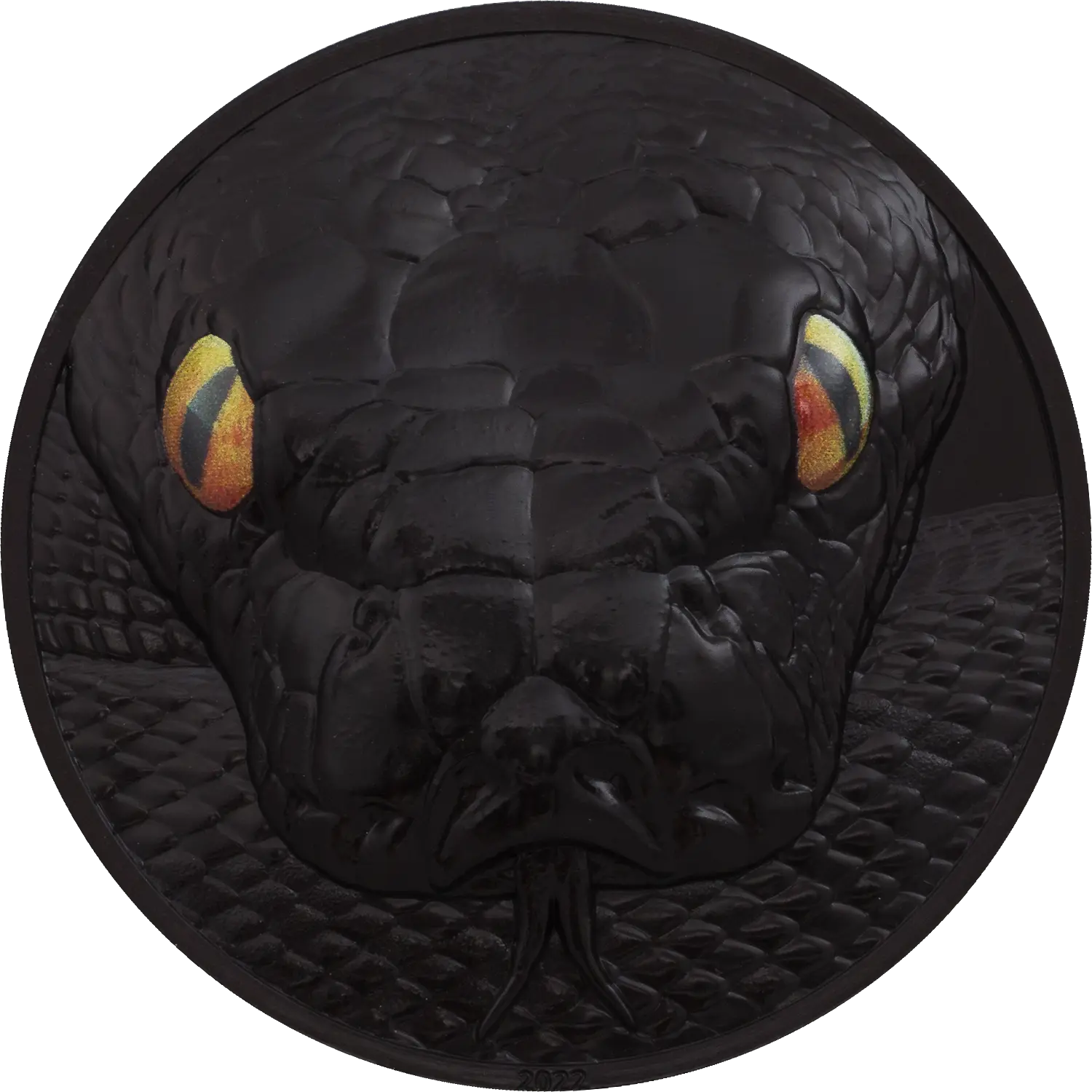 На реверсе монеты, словно в застывшем мгновении, перед зрителем возникает устрашающий взгляд чёрной змеи. Её чешуя, искусно выгравированная, переливается в полумраке, а ярко-жёлтые глаза с чёрными зрачками будто следят за каждым движением, погружая в атмосферу первобытного страха и восхищения перед силой природы.