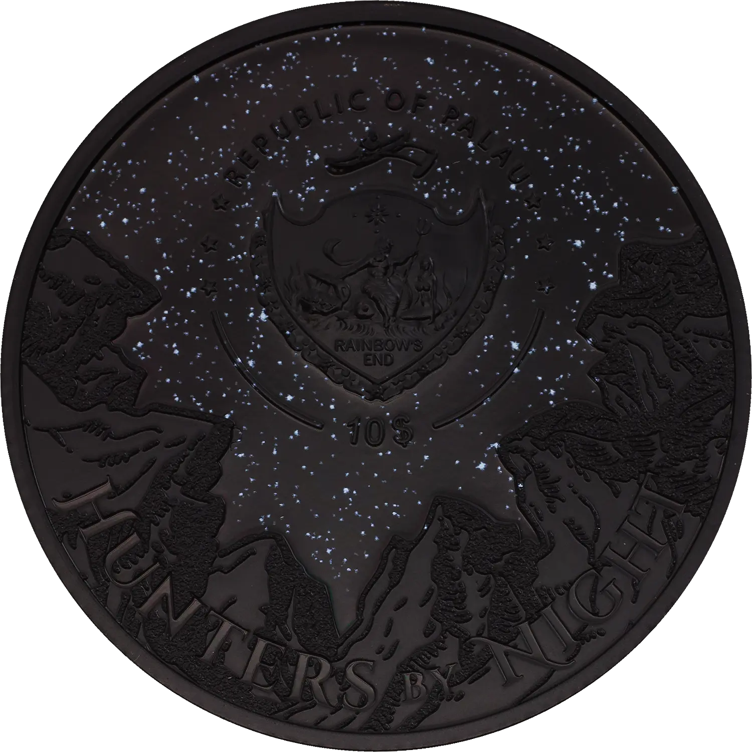 На аверсе этой монеты словно застыла таинственная ночная сцена: на фоне звёздного неба, усыпанного мерцающими точками, возвышаются тёмные силуэты гор, а в центре сияет герб Республики Палау. Надпись «HUNTERS BY NIGHT» придаёт композиции загадочность, будто приглашая зрителя в мир ночных охотников, скрывающихся в тени горных вершин, а номинал «10$» и надпись «REPUBLIC OF PALAU» подчёркивают официальный статус этого художественного произведения в металле.