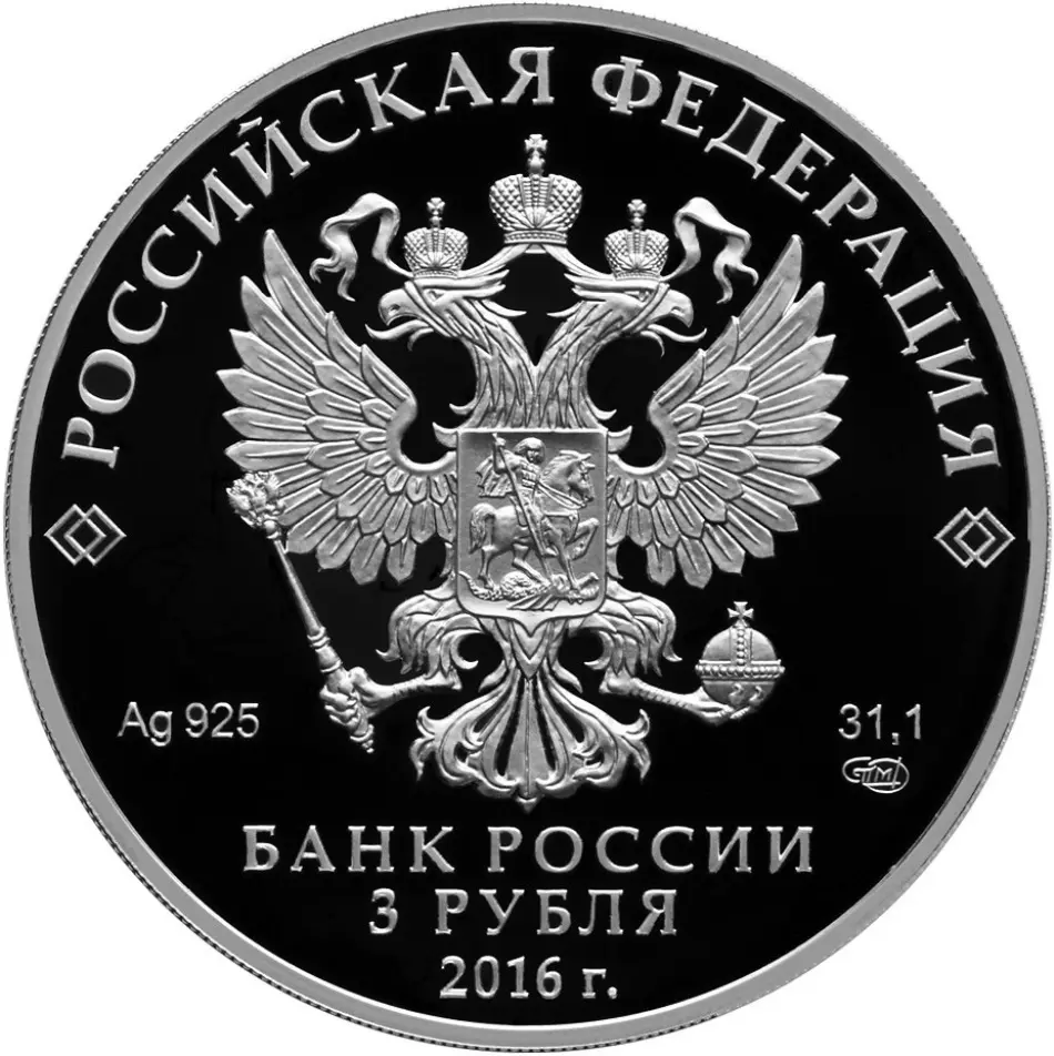 на зеркальном поле диска – рельефное изображение Государственного герба Российской Федерации, над ним вдоль канта – надпись полукругом: "РОССИЙСКАЯ ФЕДЕРАЦИЯ", обрамленная с обеих сторон сдвоенными ромбами, внизу под гербом: слева – обозначения драгоценного металла и пробы сплава, справа – содержание химически чистого металла и товарный знак монетного двора, внизу в центре в три строки – надпись: "БАНК РОССИИ", номинал монеты: "3 РУБЛЯ", год выпуска: "2016 г.".