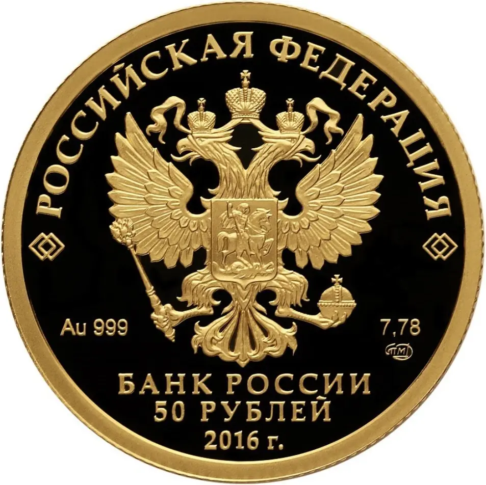 на зеркальном поле диска – рельефное изображение Государственного герба Российской Федерации, над ним вдоль канта – надпись полукругом: "РОССИЙСКАЯ ФЕДЕРАЦИЯ", обрамленная с обеих сторон сдвоенными ромбами, внизу под гербом: слева – обозначения драгоценного металла и пробы, справа – содержание химически чистого металла и товарный знак монетного двора, внизу в центре в три строки – надпись: "БАНК РОССИИ", номинал монеты: "50 РУБЛЕЙ", год выпуска: "2016 г.".