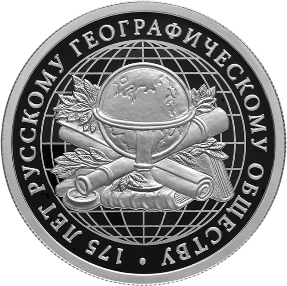 на зеркальном поле диска — рельефное изображение эмблемы Русского географического общества на фоне стилизованного изображения сети параллелей и меридианов Земли; вдоль канта — надпись: «175 ЛЕТ РУССКОМУ ГЕОГРАФИЧЕСКОМУ ОБЩЕСТВУ».