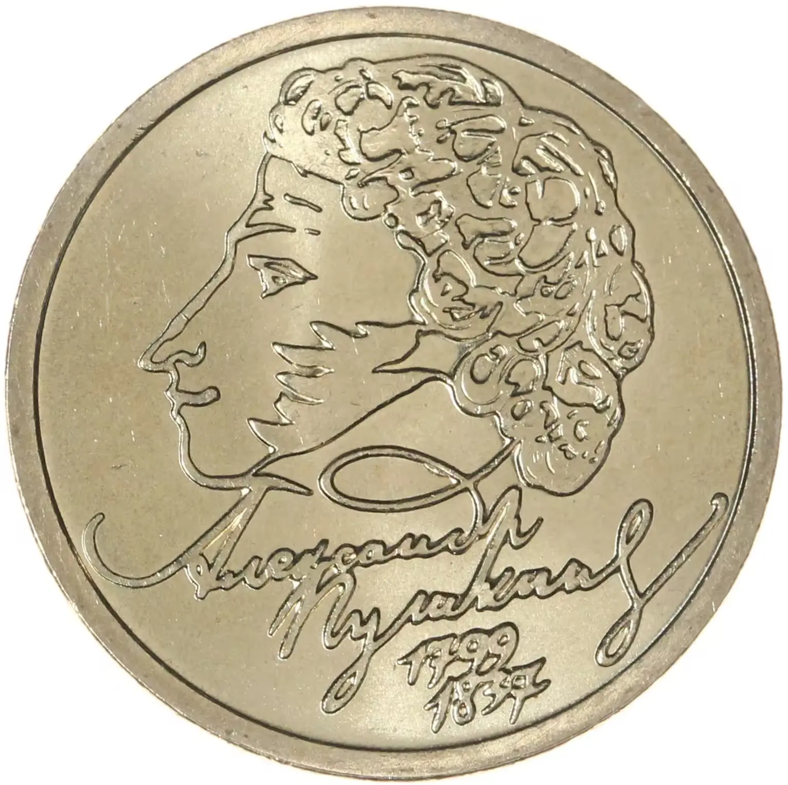 профильный автопортрет А.С.Пушкина, под ним — в четыре строки подпись факсимиле «АЛЕКСАНДР ПУШКИН» и даты «1799» «1837».
