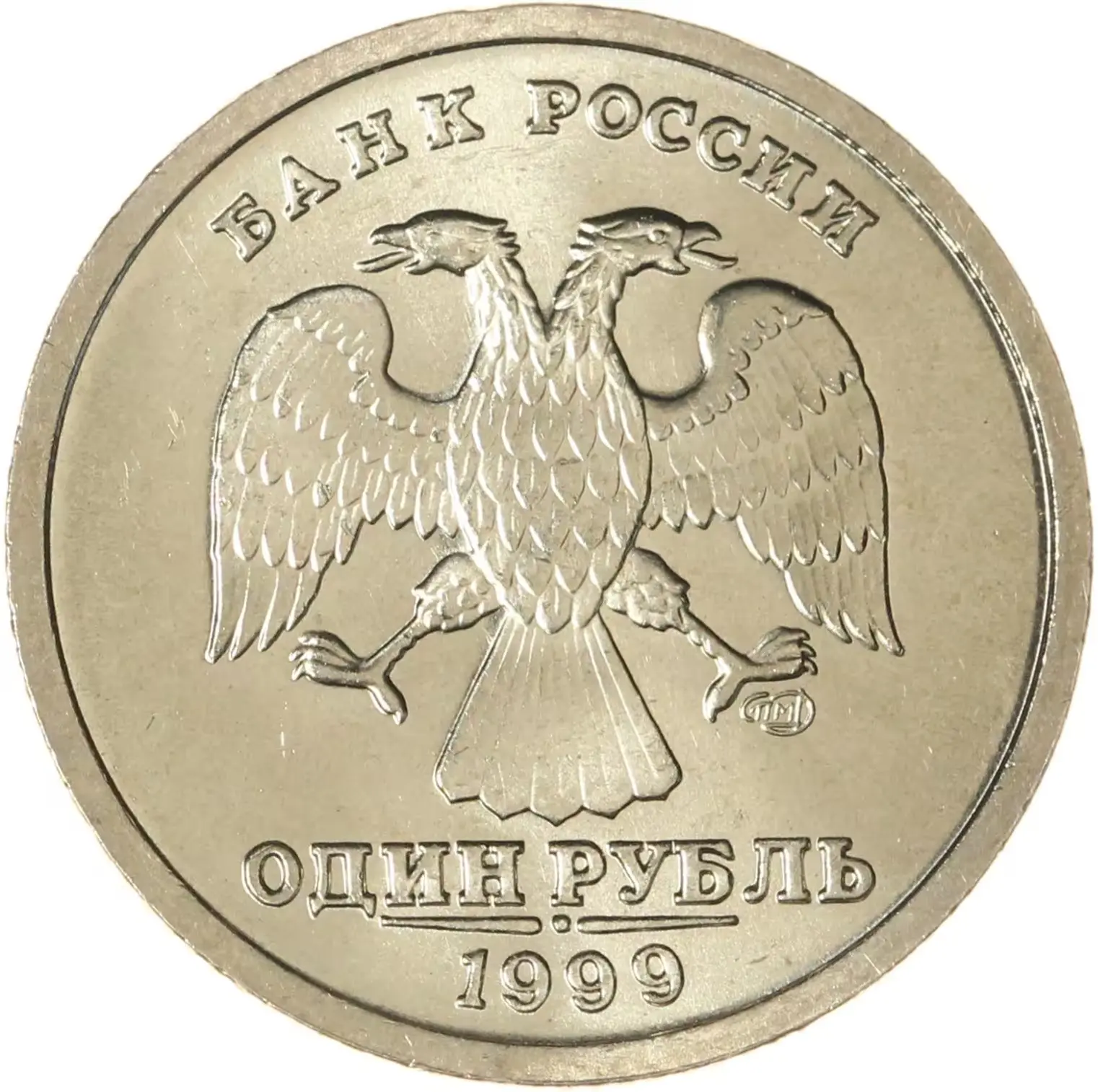 в центре диска — эмблема Банка России (двуглавый орёл художника И.Билибина), над ней — надпись полукругом «БАНК РОССИИ», под ней номинал — «ОДИН РУБЛЬ», подчёркнутый горизонтальной линией, разделённой посредине точкой, внизу — «1999 г.», справа — товарный знак монетного двора.