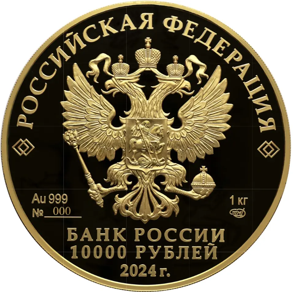 рельефное изображение Государственного герба Российской Федерации, над ним вдоль канта – надпись полукругом «РОССИЙСКАЯ ФЕДЕРАЦИЯ», обрамленная с обеих сторон сдвоенными ромбами, под гербом слева – обозначения драгоценного металла, пробы и порядковый номер монеты, справа – содержание химически чистого металла и товарный знак монетного двора, внизу в центре в три строки – надпись «БАНК РОССИИ», номинал монеты «10000 РУБЛЕЙ», год выпуска «2024 г.».