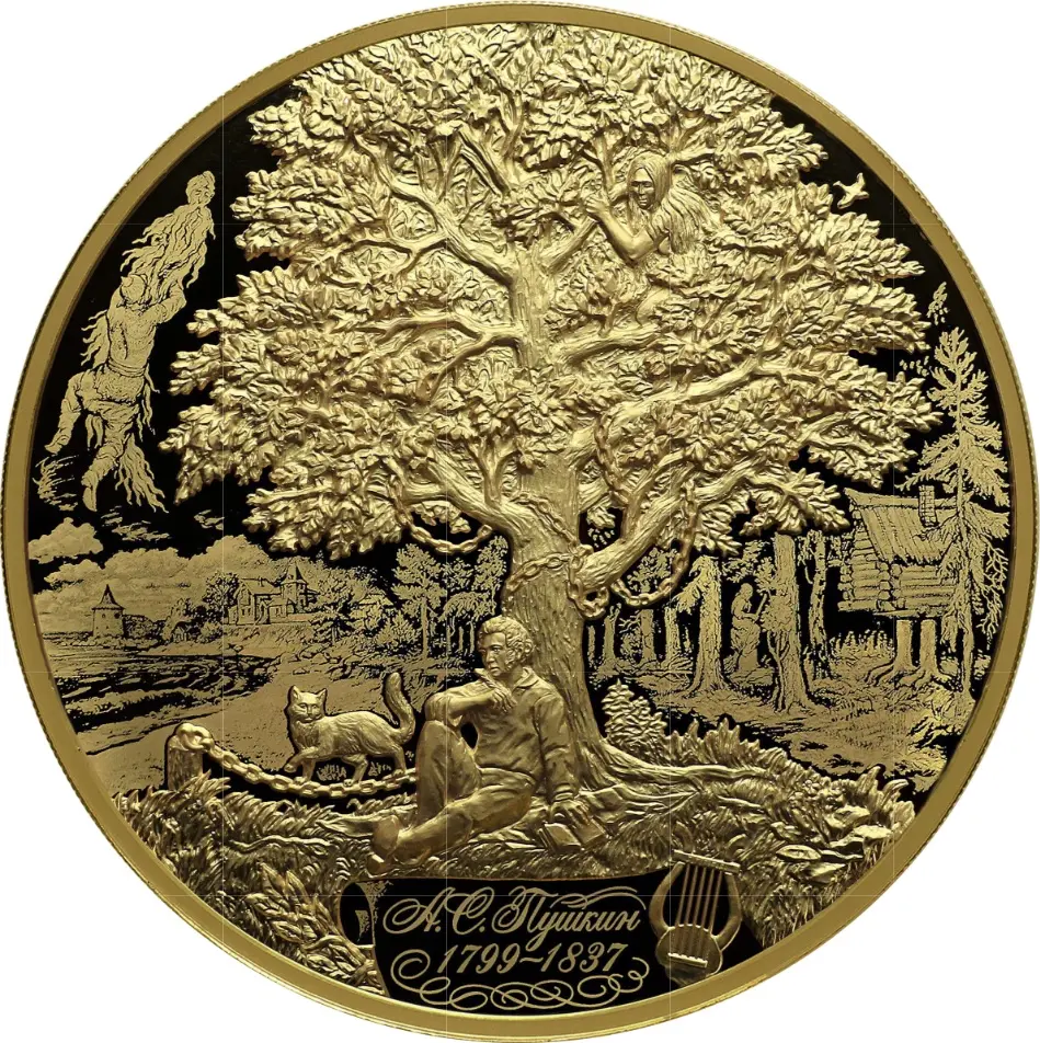 рельефное изображение А.С. Пушкина, сидящего под сказочным дубом, на фоне выполненных в технике лазерного матирования изображений сюжетов его сказок; внизу – изображение свитка с надписью «А.С. Пушкин», годами жизни «1799–1837» и орнаментом, выполненными в технике лазерного матирования, и рельефное изображение лиры.
