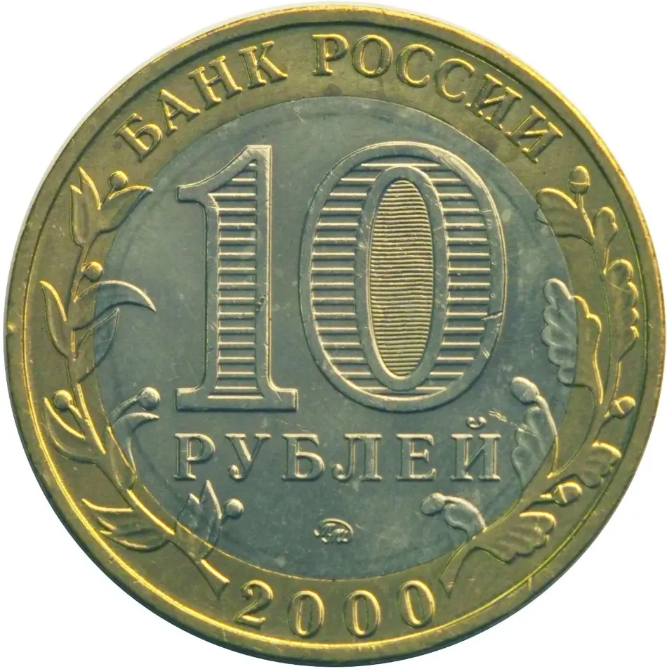 в центре диска - обозначение достоинства монеты "10 РУБЛЕЙ". Внутри цифры "0" - скрытые, видимые поочередно при изменении угла зрения изображения цифры "10" и надписи "РУБЛЕЙ". В нижней части диска - товарный знак монетного двора. В верхней части кольца по окружности - надпись: "БАНК РОССИИ", в нижней - дата "2000", слева и справа - стилизованные ветви растений, переходящие на диск.