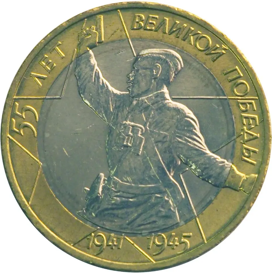 изображения солдата и контура пятиконечной звезды, переходящие с диска на кольцо. В верхней части кольца по окружности - надпись: "55 ЛЕТ ВЕЛИКОЙ ПОБЕДЫ", в нижней части - даты "1941" "1945".