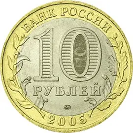 в центре диска – обозначение достоинства монеты «10 РУБЛЕЙ». Внутри цифры «0» – скрытые, видимые поочередно при изменении угла зрения изображения цифры «10» и надписи «РУБ». В нижней части диска – товарный знак монетного двора. В верхней части кольца по окружности – надпись: «БАНК РОССИИ», в нижней – дата «2005», слева и справа – стилизованные ветви растений, переходящие на диск.