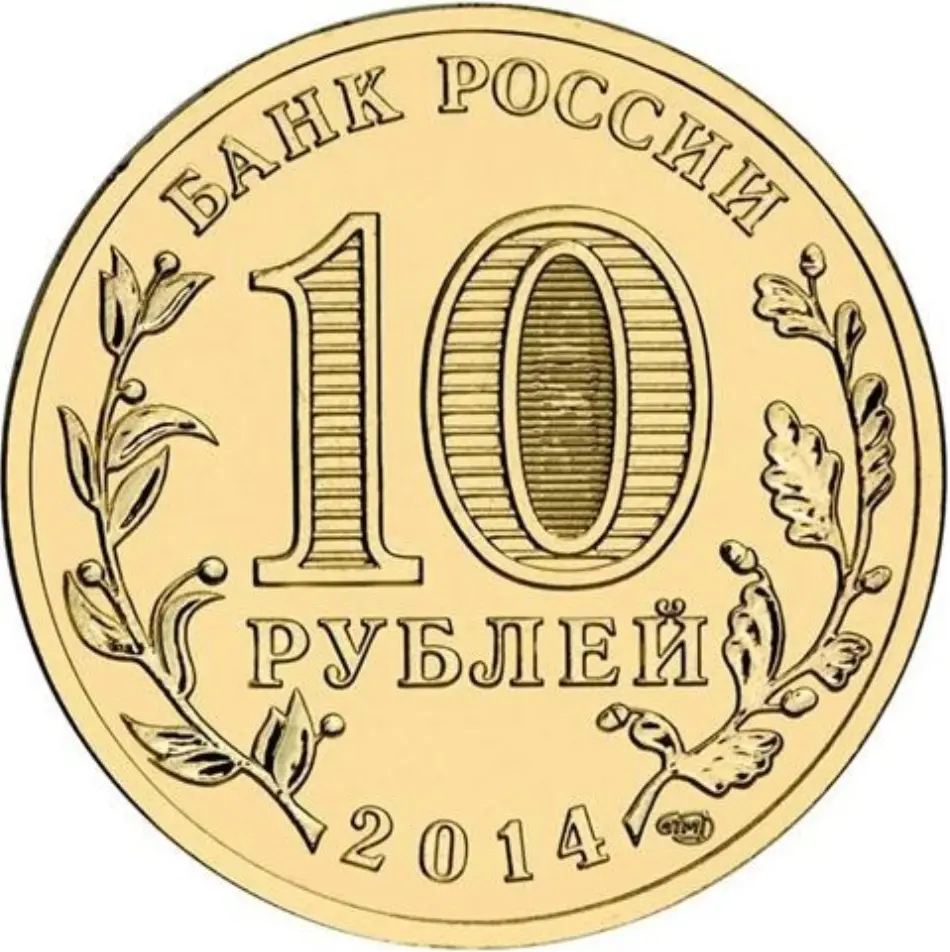 в центре диска – обозначение номинала монеты "10 РУБЛЕЙ". Внутри цифры "0" – скрытые, видимые поочередно при изменении угла зрения изображения числа "10" и надписи "РУБ". По окружности вдоль канта – надписи, вверху: "БАНК РОССИИ", внизу – дата: "2014", слева – стилизованное изображение лавровой ветви, справа – дубовой.