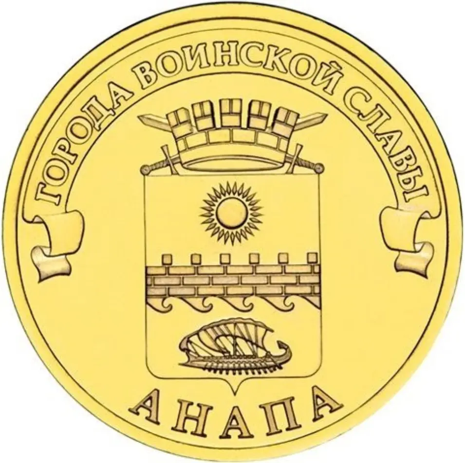 герб города Анапы, над ним, на ленте – надпись полукругом: "ГОРОДА ВОИНСКОЙ СЛАВЫ", внизу вдоль канта – надпись: "АНАПА".