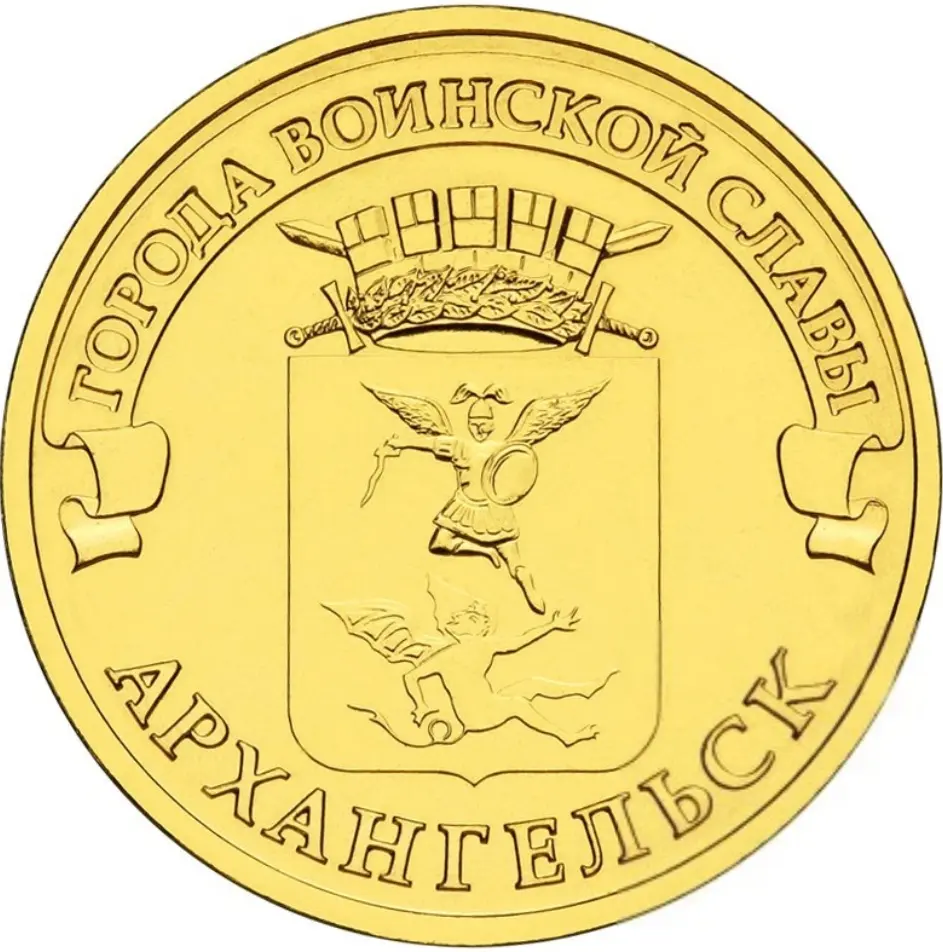герб города Архангельска, над ним, на ленте – надпись полукругом: "ГОРОДА ВОИНСКОЙ СЛАВЫ", внизу, вдоль канта – надпись: "АРХАНГЕЛЬСК".