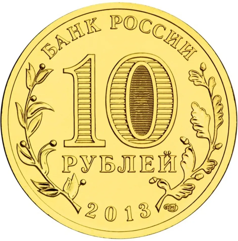 в центре диска – обозначение номинала монеты "10 РУБЛЕЙ". Внутри цифры "0" – скрытые, видимые поочередно при изменении угла зрения изображения цифры "10" и надписи "РУБ". По окружности вдоль канта – надписи, вверху: "БАНК РОССИИ", внизу – дата: "2013", слева – стилизованное изображение лавровой ветви, справа – дубовой.