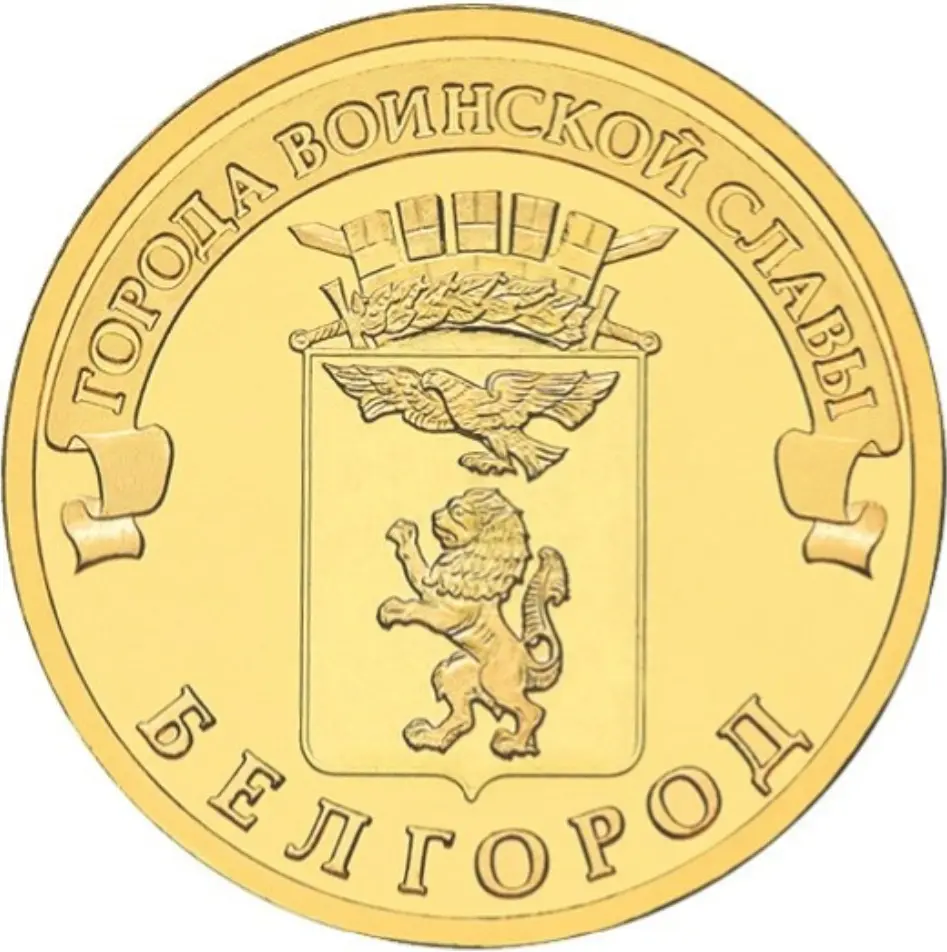 герб города Белгорода, над ним, на ленте - надпись полукругом: "ГОРОДА ВОИНСКОЙ СЛАВЫ", внизу, вдоль канта - надпись: "БЕЛГОРОД"
