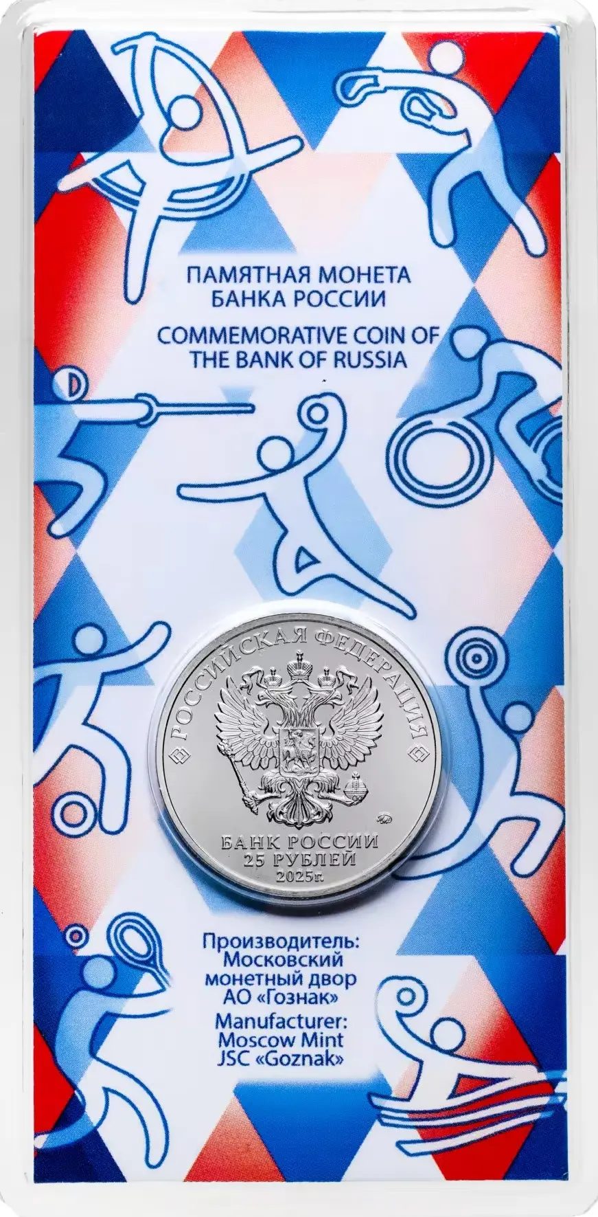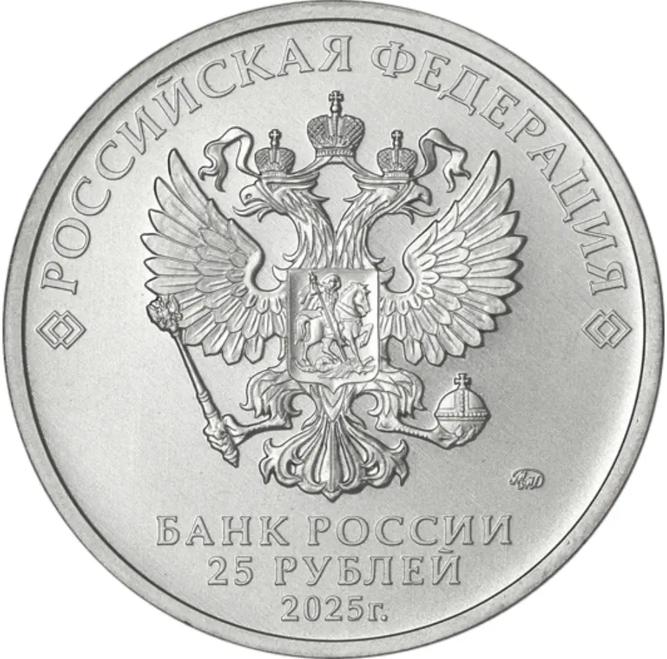 рельефное изображение Государственного герба Российской Федерации, над ним вдоль канта – надпись полукругом «РОССИЙСКАЯ ФЕДЕРАЦИЯ», обрамленная с обеих сторон сдвоенными ромбами, под гербом в центре в три строки – надпись «БАНК РОССИИ», номинал монеты «25 РУБЛЕЙ», год выпуска «2025 г.», справа – товарный знак монетного двора.