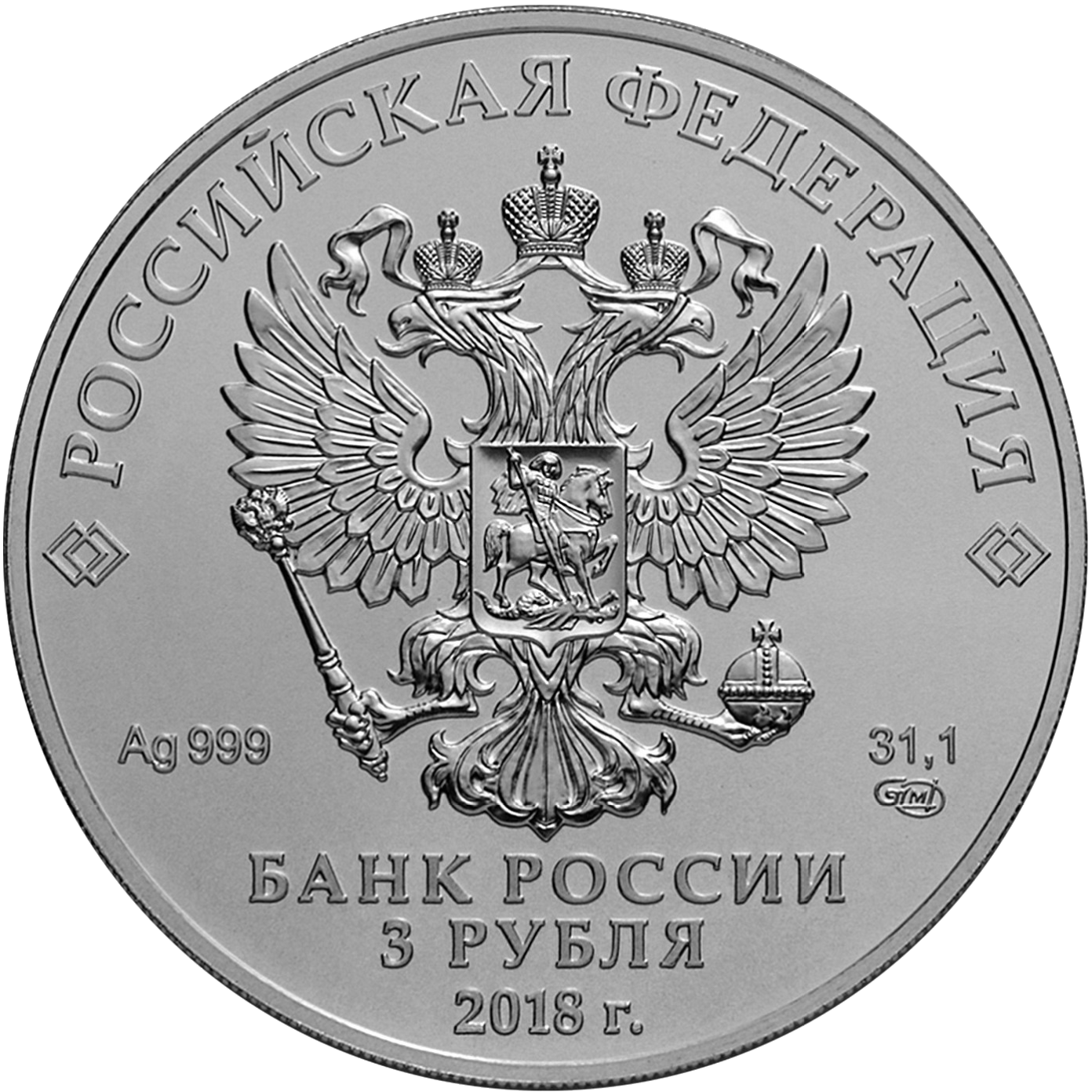 в центре – рельефное изображение Государственного герба Российской Федерации, над ним вдоль канта – надпись полукругом: "РОССИЙСКАЯ ФЕДЕРАЦИЯ", обрамленная с обеих сторон сдвоенными ромбами, внизу под гербом: слева – обозначения драгоценного металла и пробы, справа – содержание химически чистого металла и товарный знак монетного двора, внизу в центре в три строки – надпись: "БАНК РОССИИ", номинал монеты: "3 РУБЛЯ", год: "2018 г.".