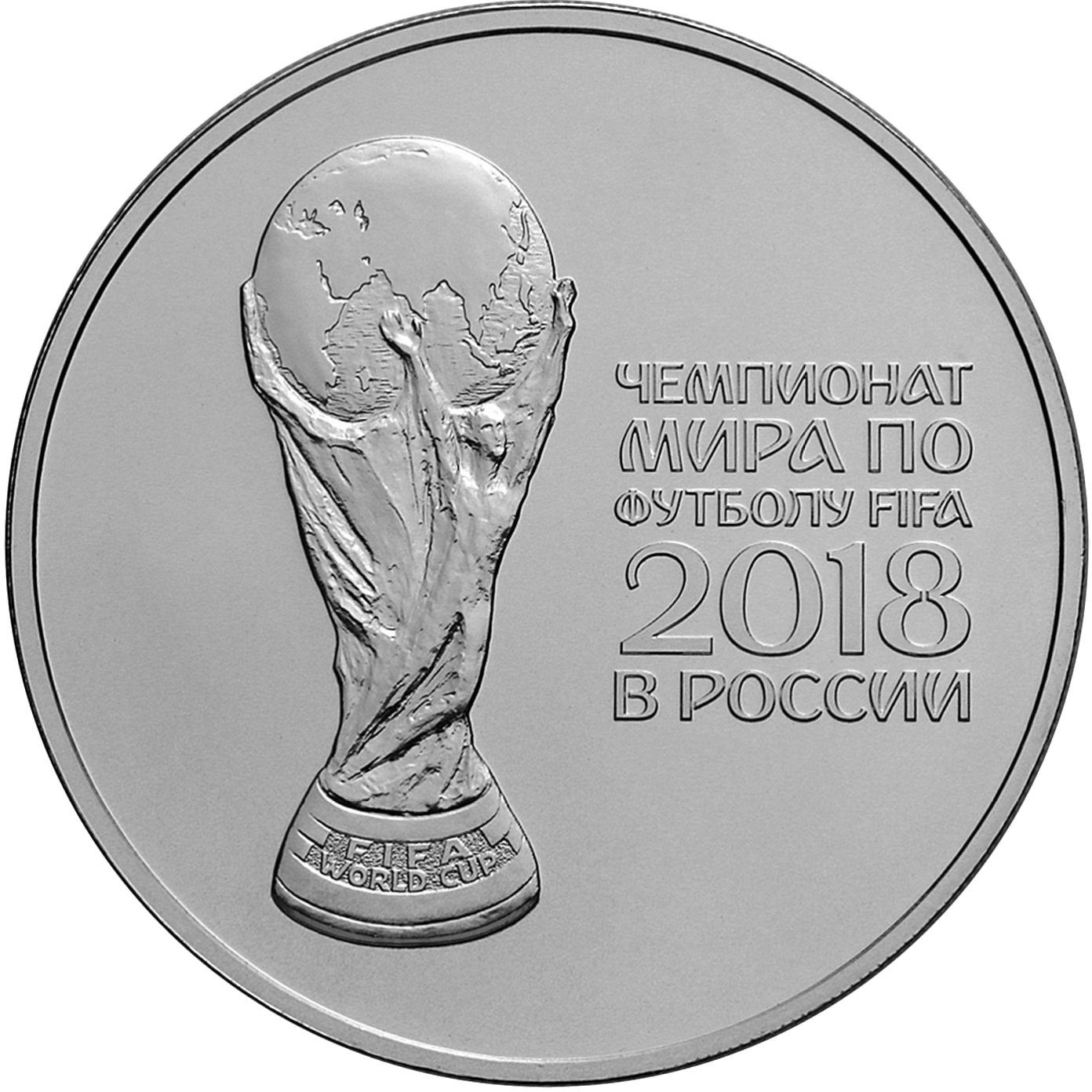 рельефное изображение Кубка Чемпионата мира по футболу FIFA, справа – надпись в пять строк: "ЧЕМПИОНАТ МИРА ПО ФУТБОЛУ FIFA 2018 В РОССИИ".