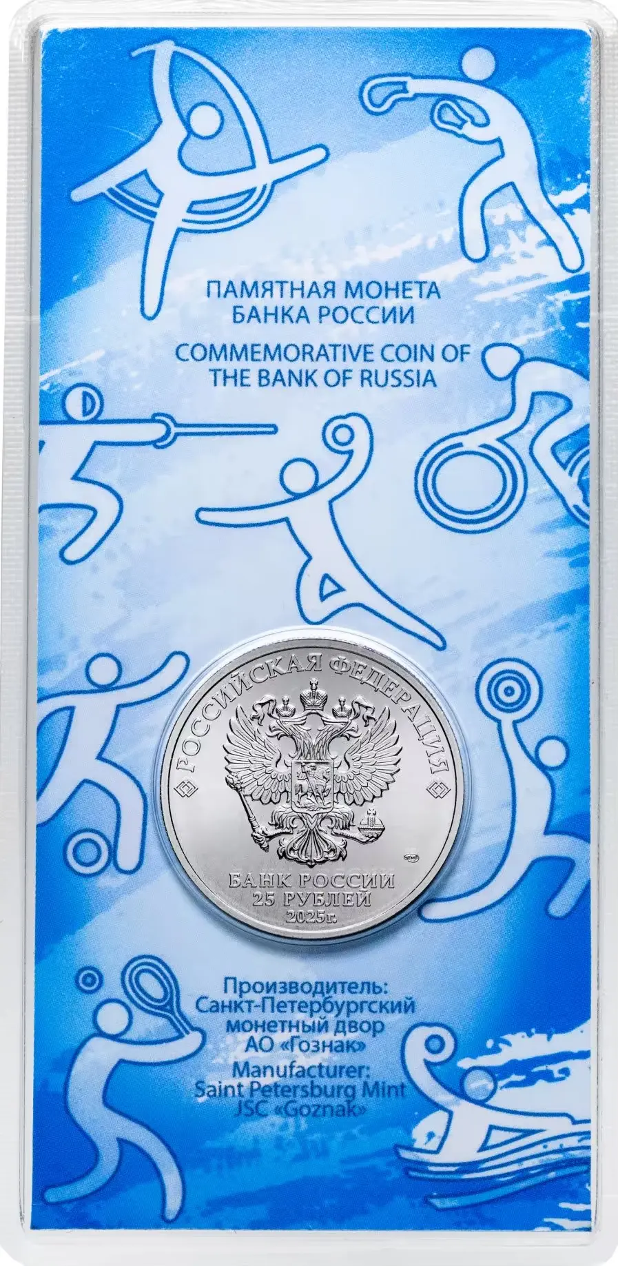 рельефное изображение Государственного герба Российской Федерации, над ним вдоль канта – надпись полукругом «РОССИЙСКАЯ ФЕДЕРАЦИЯ», обрамленная с обеих сторон сдвоенными ромбами, под гербом в центре в три строки – надпись «БАНК РОССИИ», номинал монеты «25 РУБЛЕЙ», год выпуска «2025 г.», справа – товарный знак монетного двора.