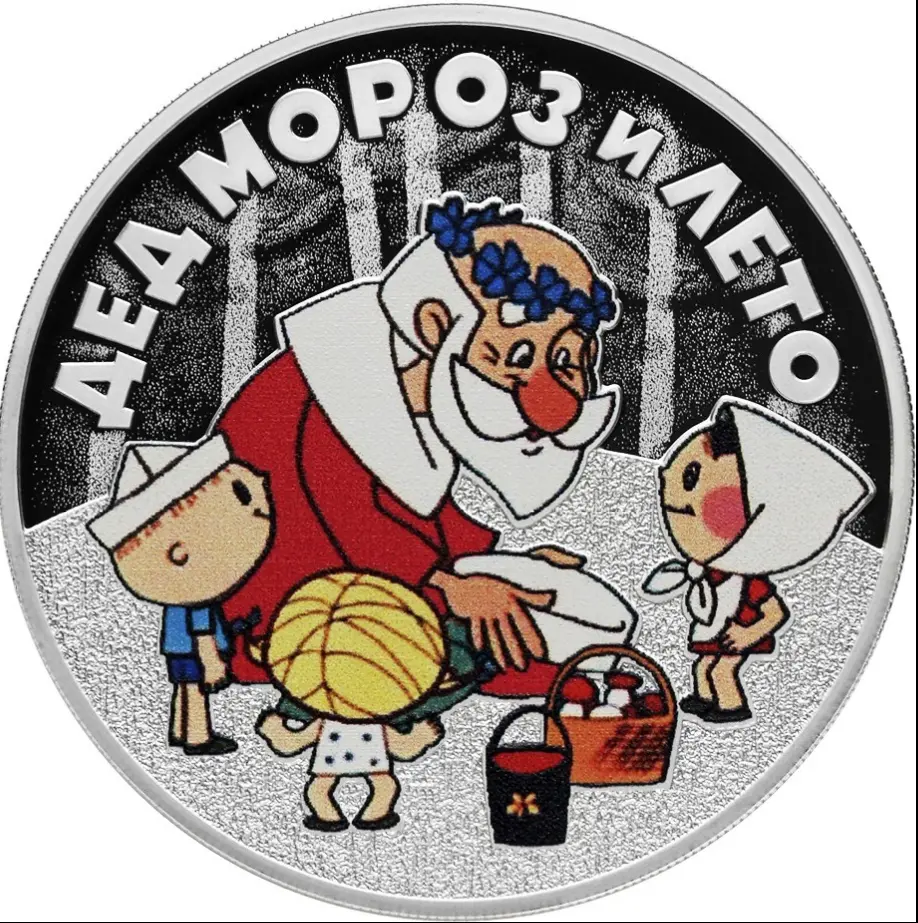 на зеркальном поле диска – выполненное в цвете изображение сцены из мультфильма; вверху вдоль канта – надпись: "ДЕД МОРОЗ И ЛЕТО".