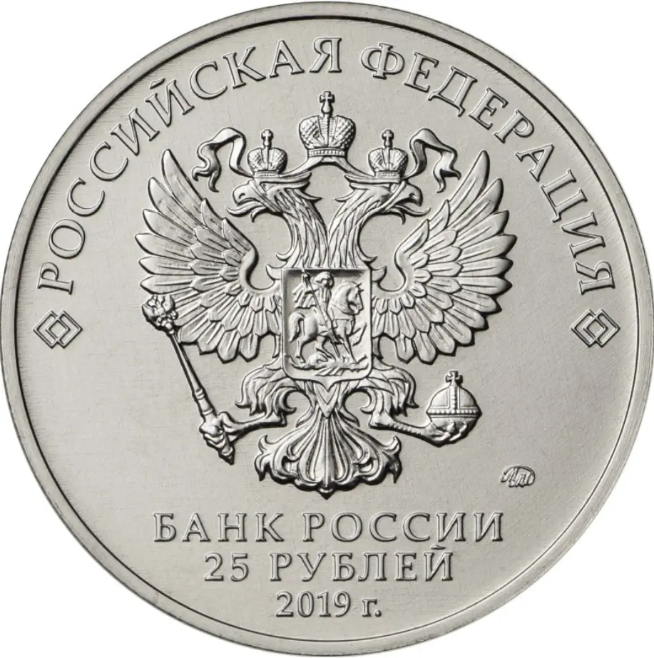 в центре – рельефное изображение Государственного герба Российской Федерации, над ним вдоль канта – надпись полукругом: "РОССИЙСКАЯ ФЕДЕРАЦИЯ", обрамленная с обеих сторон сдвоенными ромбами, под гербом в центре в три строки – надпись: "БАНК РОССИИ", номинал монеты: "25 РУБЛЕЙ", год выпуска: "2019 г.", справа – товарный знак монетного двора.