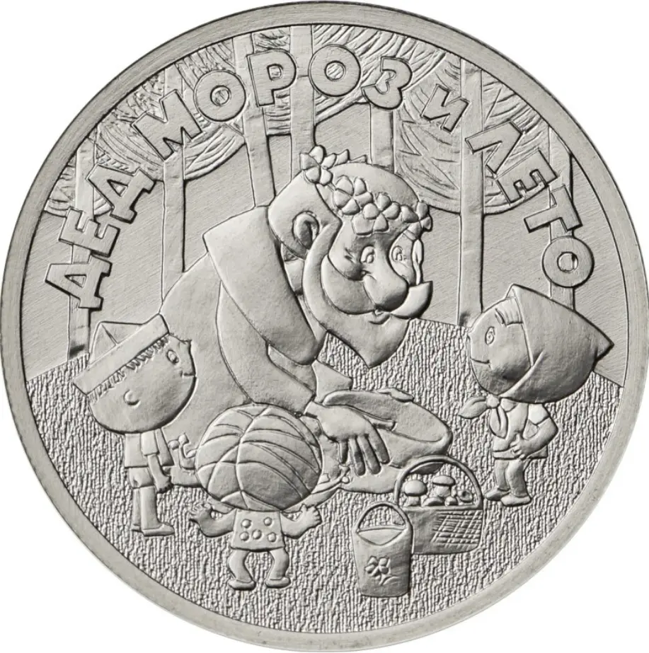 рельефное изображение сцены из мультфильма; вверху вдоль канта – надпись: "ДЕД МОРОЗ И ЛЕТО".