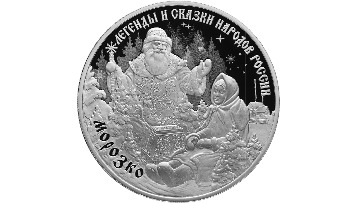 на зеркальном поле диска в центре — выполненная рельефом сцена из сказки «Морозко» на фоне стилизованных изображений леса, звезд и снежинок; вдоль канта — надписи, вверху: «ЛЕГЕНДЫ И СКАЗКИ НАРОДОВ РОССИИ», внизу слева: «МОРОЗКО».