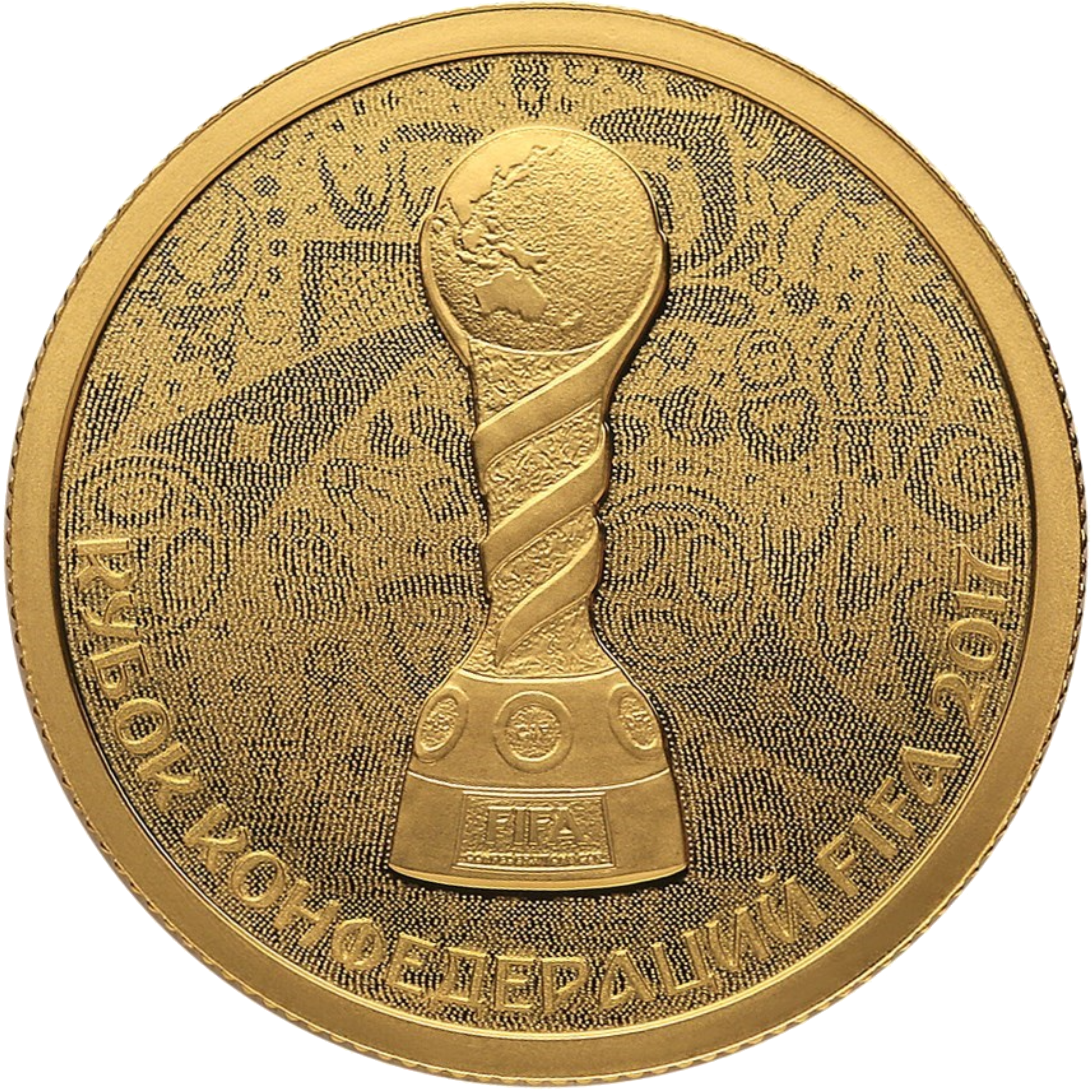 рельефное изображение Кубка конфедераций FIFA на фоне орнамента, состоящего из элементов, отображающих российскую культуру и фольклорное наследие, а также футбольный мир, внизу по окружности – надпись: "КУБОК КОНФЕДЕРАЦИЙ FIFA 2017".