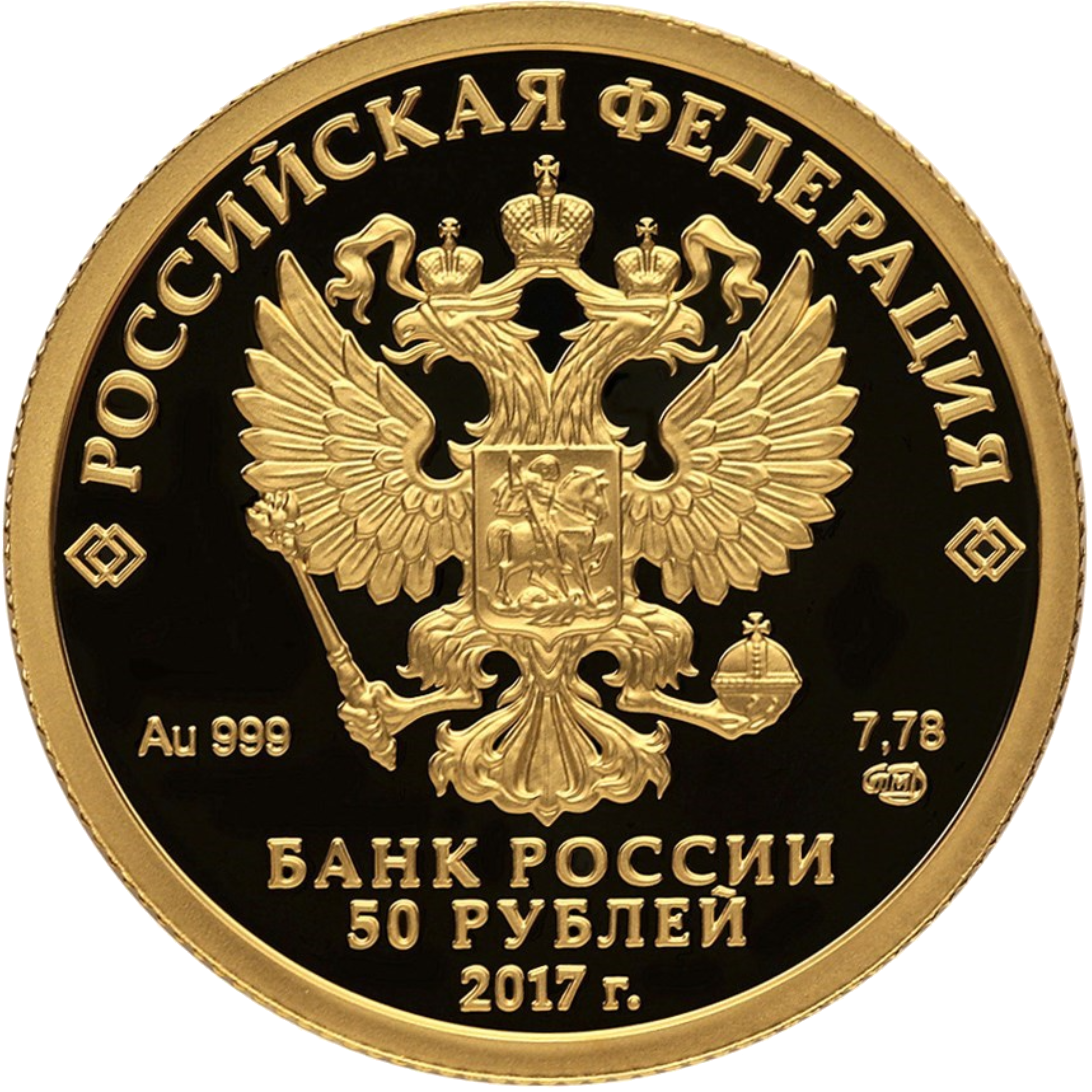 на зеркальном поле диска – рельефное изображение Государственного герба Российской Федерации, над ним вдоль канта – надпись полукругом: "РОССИЙСКАЯ ФЕДЕРАЦИЯ", обрамленная с обеих сторон сдвоенными ромбами, внизу под гербом: слева – обозначения драгоценного металла и пробы, справа – содержание химически чистого металла и товарный знак монетного двора, внизу в центре в три строки – надпись: "БАНК РОССИИ", номинал монеты: "50 РУБЛЕЙ", год: "2017 г.".