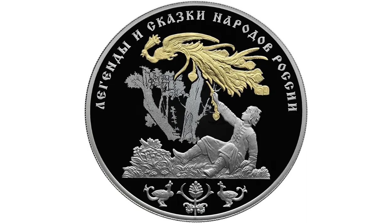 на зеркальном поле диска – рельефное изображение золотой жар-птицы, взлетающей с дерева, и Ивана-царевича, поймавшего ее перо, внизу – элементы традиционного русского орнамента, вверху вдоль канта – надпись: "ЛЕГЕНДЫ И СКАЗКИ НАРОДОВ РОССИИ".