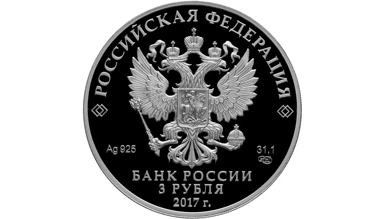 на зеркальном поле диска – рельефное изображение Государственного герба Российской Федерации, над ним вдоль канта – надпись полукругом: "РОССИЙСКАЯ ФЕДЕРАЦИЯ", обрамленная с обеих сторон сдвоенными ромбами, внизу под гербом: слева – обозначения драгоценного металла и пробы сплава, справа – содержание химически чистого металла и товарный знак монетного двора, внизу в центре в три строки – надпись: "БАНК РОССИИ", номинал монеты: "3 РУБЛЯ", год выпуска: "2017 г.".