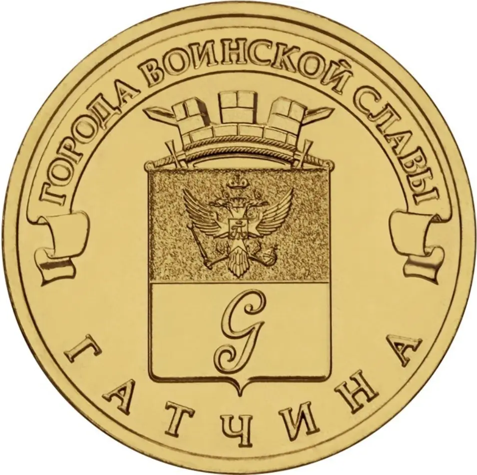 герб города Гатчина, над ним, на ленте – надпись полукругом: "ГОРОДА ВОИНСКОЙ СЛАВЫ", внизу вдоль канта – надпись: "ГАТЧИНА".