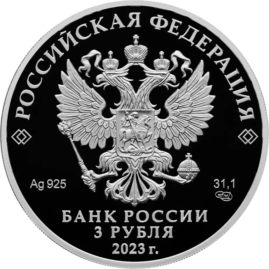 рельефное изображение Государственного герба Российской Федерации, над ним вдоль канта – надпись полукругом: «РОССИЙСКАЯ ФЕДЕРАЦИЯ», обрамленная с обеих сторон сдвоенными ромбами, под гербом: слева – обозначения драгоценного металла и пробы сплава, справа – содержание химически чистого металла и товарный знак монетного двора, внизу в центре в три строки – надпись: «БАНК РОССИИ», номинал монеты: «3 РУБЛЯ», год выпуска: «2023 г.».