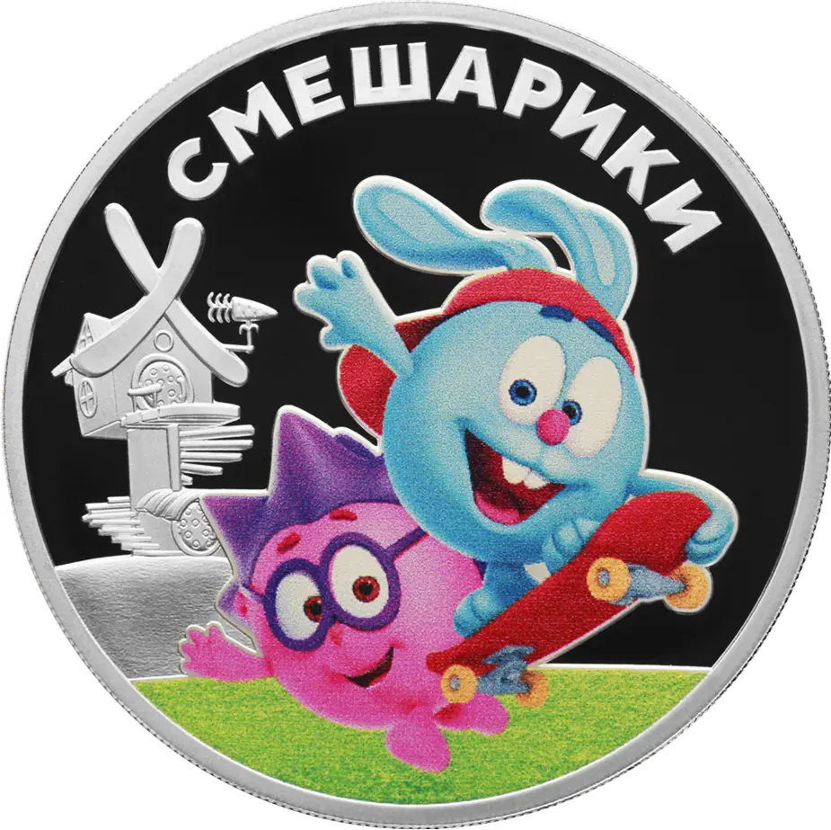 выполненное в цвете изображение героев мультфильма «Смешарики» на фоне рельефного изображения домика одного из героев; вверху по окружности имеется рельефная надпись: «СМЕШАРИКИ».