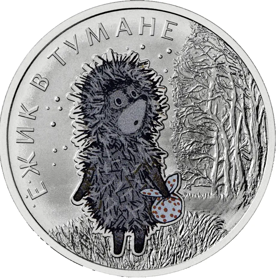 выполненное в рельефе и цвете изображение героя мультфильма «Ежик в тумане», стоящего на холмике, на фоне пейзажа, выполненного рельефом, и тумана; вверху слева по окружности – рельефная надпись «ЕЖИК В ТУМАНЕ».