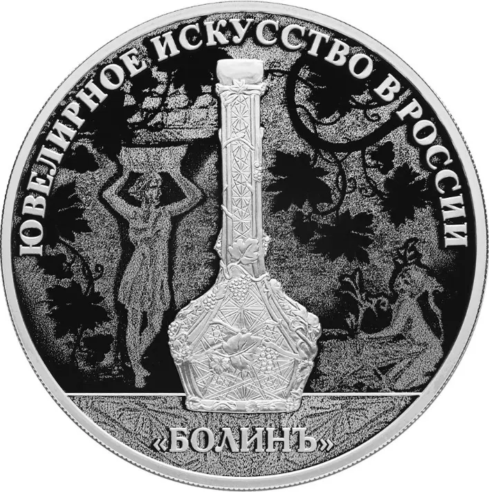 рельефное изображение изделия ювелирной фирмы "Болин" – хрустального кувшина в серебряной оправе на фоне стилизованной композиции по мотивам других изделий фирмы; вверху вдоль канта – надпись "ЮВЕЛИРНОЕ ИСКУССТВО В РОССИИ", внизу – надпись "БОЛИНЪ".