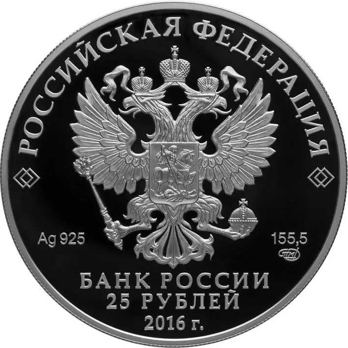 на зеркальном поле диска – рельефное изображение Государственного герба Российской Федерации, над ним вдоль канта – надпись полукругом: "РОССИЙСКАЯ ФЕДЕРАЦИЯ", обрамленная с обеих сторон сдвоенными ромбами, внизу под гербом: слева – обозначения драгоценного металла и пробы сплава, справа – содержание химически чистого металла и товарный знак монетного двора, внизу в центре в три строки – надпись: "БАНК РОССИИ", номинал монеты: "25 РУБЛЕЙ", год выпуска: "2016 г.".